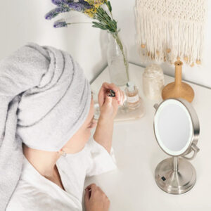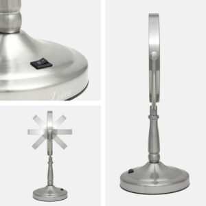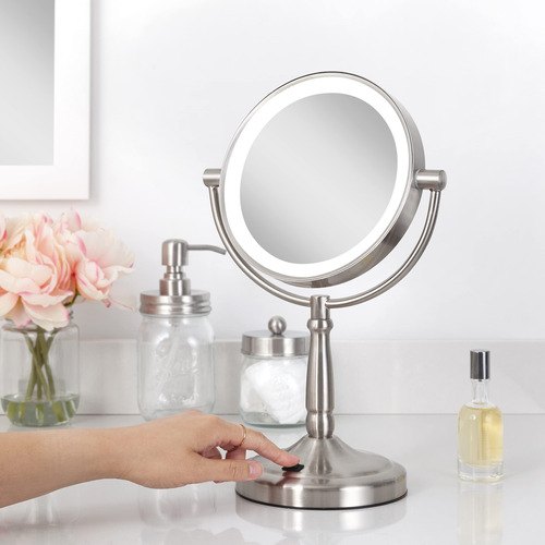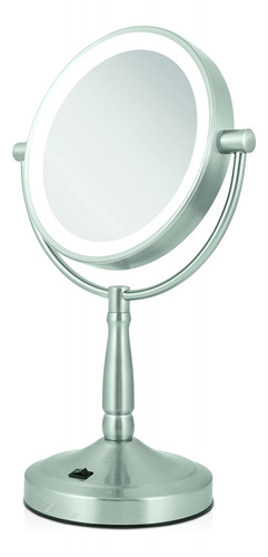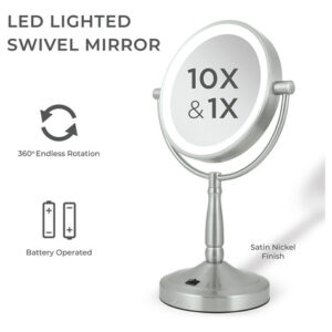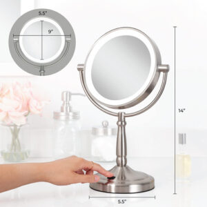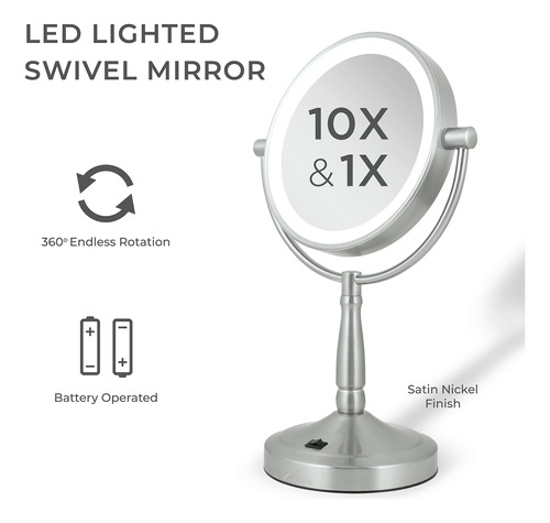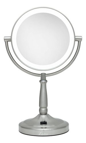 Espelho de maquiagem LED redondo Zadro de 9" com luzes e ampliação Espelho de maquiagem giratório iluminado por bateria AA de 5 e 10x/1x – Espelho de maquiagem de dupla face com ampliação de 10x e 1x e acabamento em níquel acetinado gira 360 graus – O espelho mede 5,5 polegadas de diâmetro; tem 14 polegadas de altura. Base antiderrapante – A iluminação LED economizadora de energia consome até 70% menos eletricidade do que as lâmpadas comuns. Tamanho da superfície refletiva: 7 x 7 polegadas – O design sem fio requer 4 pilhas AA (não incluídas) – Inovadora líder há mais de 30 anos, a Zadro oferece uma ampla variedade de espelhos para cuidados pessoais, produtos de banho e saúde e bem-estar – Espelho iluminado por LED – Vidro de dupla face com qualidade óptica, ampliação de 10x e 1x – Sem fio, o design alimentado por bateria usa 4 pilhas AA (não incluídas) – acabamento em níquel acetinado