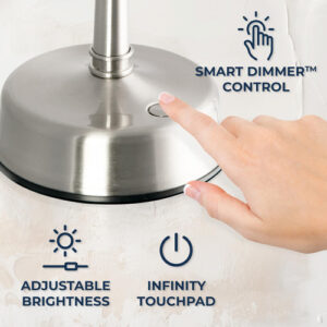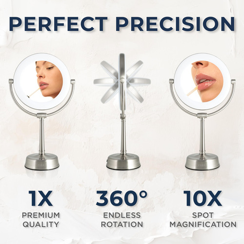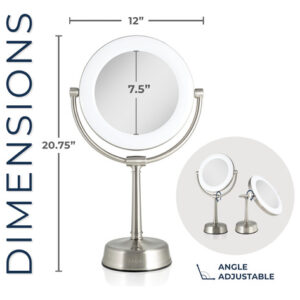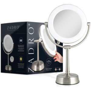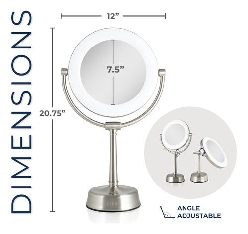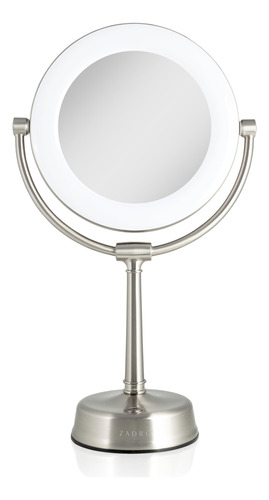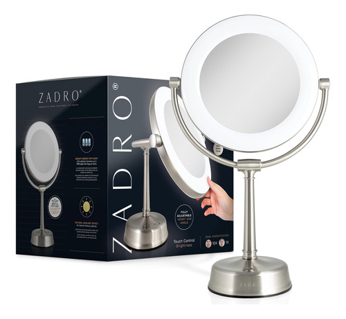 Espelho de maquiagem iluminado por LED Zadro Lexington com ampliação Espelho giratório de dois lados com luzes para maquiagem (10X/1X, 12" L x 20" H, cabeça de 10", espelho de 7,5", níquel acetinado) – 12 polegadas de largura por 20 polegadas de altura, cabeça de espelho de 10 polegadas de diâmetro, superfície espelhada de vidro refletivo de 7,5 polegadas de diâmetro, pesa 5,7 libras – controle de brilho do touchpad Infinity Dimmer e lembre-se do último nível de brilho usado, localizado na parte frontal da base robusta do pedestal – anel de luz LED de 22 watts e 9 polegadas de diâmetro, regulável de branco suave a branco frio, temperatura de luz máxima de 6.400 K – Cabeça de espelho giratória de 2 lados de 10 vezes e 1 vez com rotação infinita, sem fios internos que quebrem ao girar – Adaptador AC de parede incluído, melhor usado em penteadeiras de mesa ou bancadas lisas