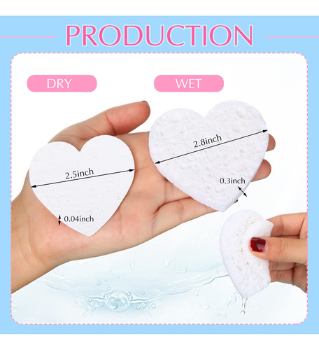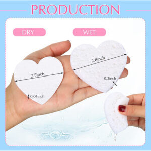 – Compressão e portabilidade: essas esponjas esfoliantes em forma de coração para lavar o rosto são comprimidas para facilitar o armazenamento e o transporte. Cada esponja pode se expandir até 2,8 polegadas de largura e 0,3 polegadas de espessura após absorver água suficiente; mergulhe na água várias vezes antes de usar até que se expanda para o tamanho normal