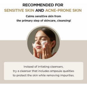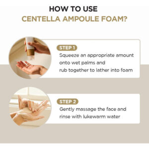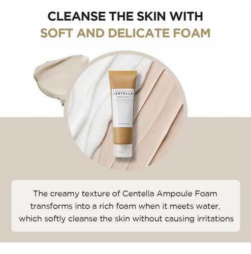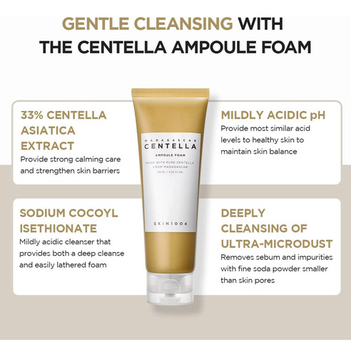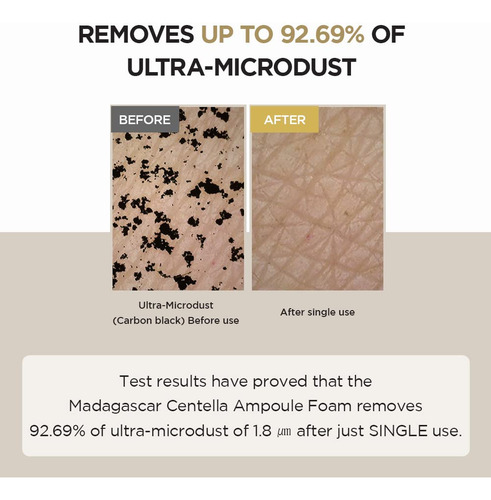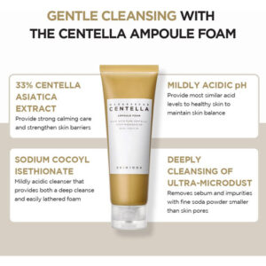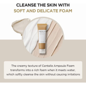 Feito com centela pura de Madagascar, limpador de cuidado diário Centella Asiatica, calmante e equilibrador de pH, efeito de limpeza de partículas ultrafinas. Teste completo de irritação da pele. Este limpador de espuma em ampola contém extrato de Centella Asiatica de Madagascar. A fórmula hipoalergênica levemente ácida equilibra o nível de pH da pele e os surfactantes naturais criam uma espuma rica que limpa a pele deixando-a hidratada e macia. – Um limpador de espuma natural levemente ácido com pH de 5 – O poder de limpeza avançado remove 92,69% da poeira fina – Cria uma espuma rica e delicada com um acabamento macio e hidratante – Consiste em 30% de ampola Centella que acalma e equilibra a pele – Ultrafina o pó de bicarbonato de sódio se liga ao sebo e aos resíduos nos poros para removê-los com eficácia