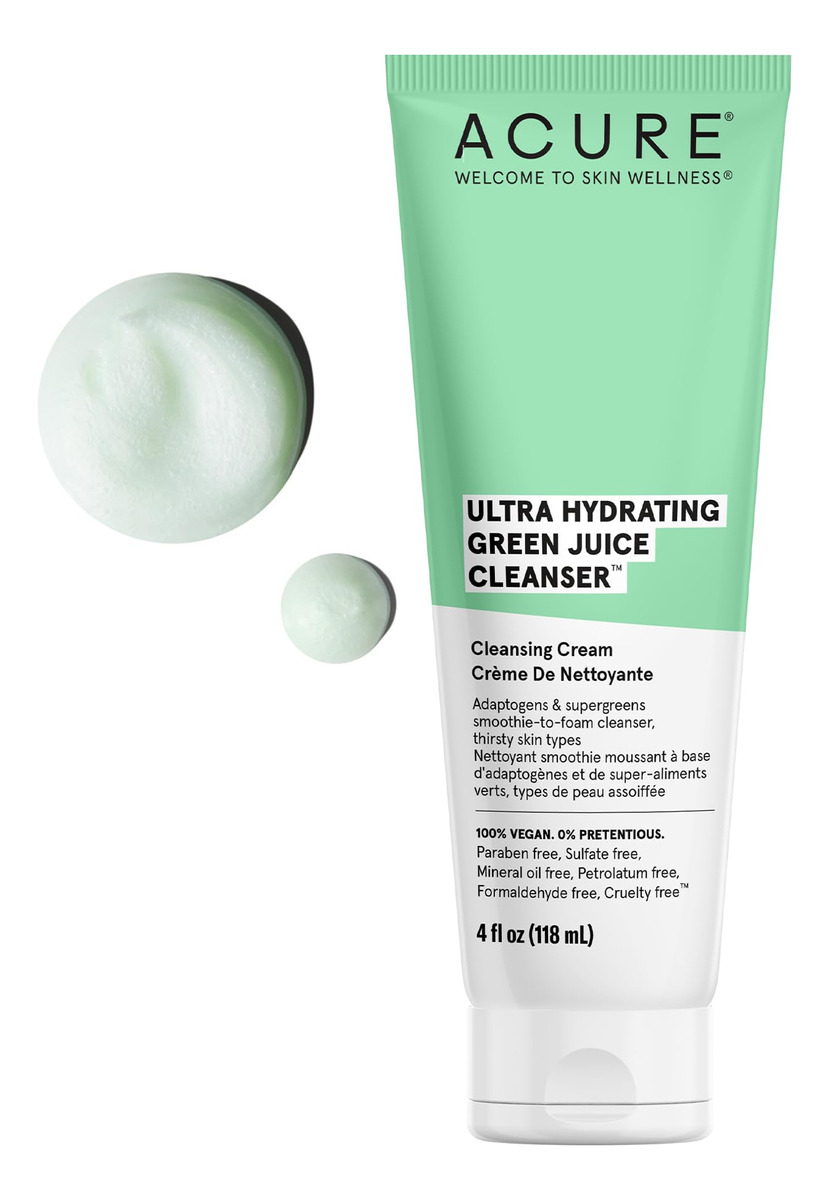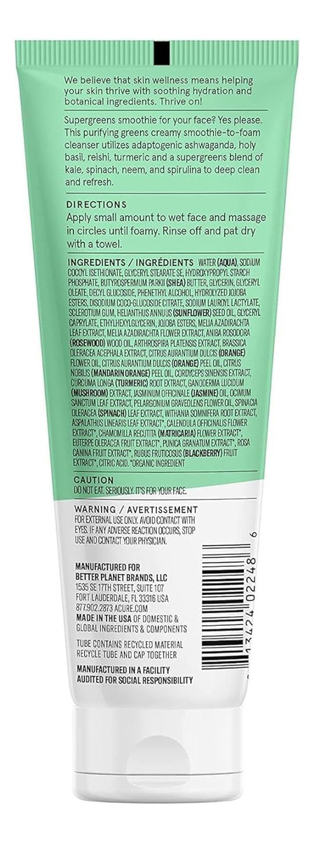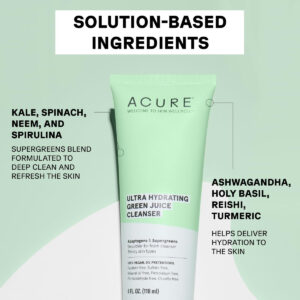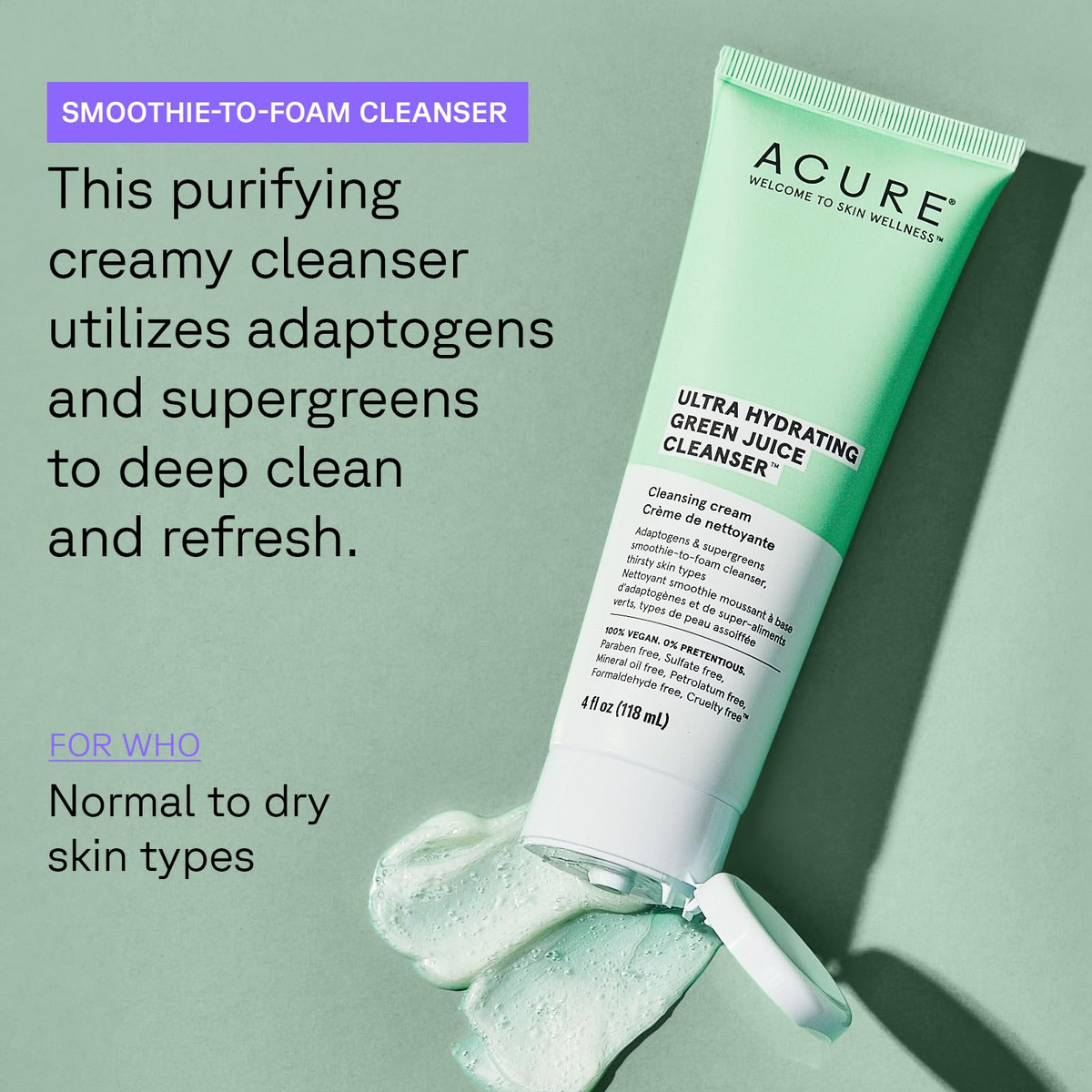 Limpador facial Acure Ultra Hydrating Green Juice — Espuma de limpeza facial diurna e noturna, 4 fl oz — HIDRATAÇÃO PROFUNDA — Obtenha uma pele incrivelmente úmida e revigorada com nosso limpador de suco verde ultra hidratante. É repleto de ingredientes especiais, como ashwagandha, manjericão sagrado, reishi, açafrão, couve, espinafre, neem e espirulina, que nutrem e revitalizam profundamente a pele. – VERDURAS NATURAIS E ESTIMULANTES DA PELE – o poder das superverduras encontra os adaptógenos neste limpador facial. Aproveite os benefícios da couve, espinafre, neem, espirulina, ashwagandha, manjericão sagrado e reishi, um suplemento de superalimento, que se misturam perfeitamente para purificar e rejuvenescer a pele. – ESPECIALIZADO PARA PELES SEDENTAS – Projetado especificamente para tipos de pele seca e sedenta, este limpador é a melhor solução de hidratação. Este cuidado para a pele é formulado para hidratar, reabastecer e refrescar, deixando sua pele mimada e rejuvenescida. – LIMPADOR DE TEXTURA DE SMOOTHIE A ESPUMA – A fórmula de smoothie para espuma transforma e remove a sujeira, a maquiagem e o excesso de oleosidade, deixando sua pele profundamente limpa e revigorada. A espuma penetra em todos os cantos e recantos, garantindo uma limpeza completa. – 100% vegana e livre de produtos químicos agressivos – Nossa fórmula é livre de parabenos, sulfatos, formaldeído e outras substâncias nocivas. Desfrute de uma limpeza suave e eficaz sem comprometer o brilho natural e saudável da sua pele