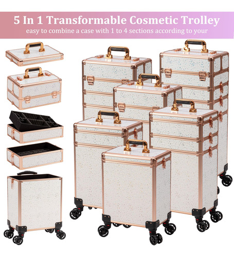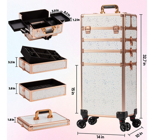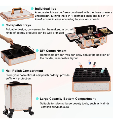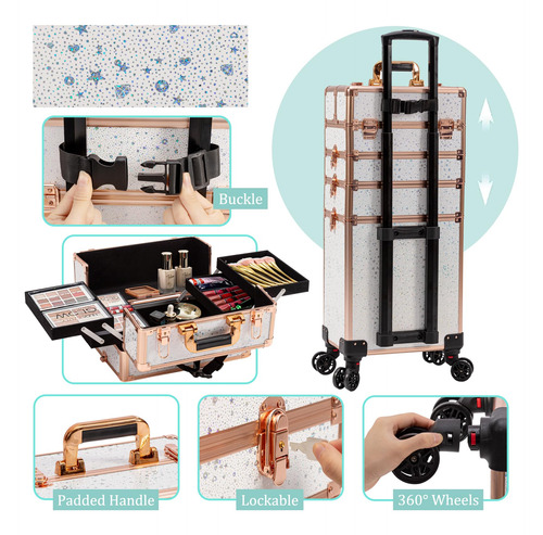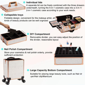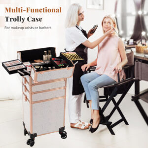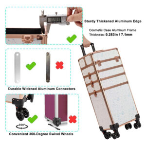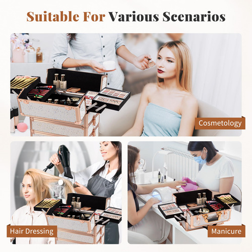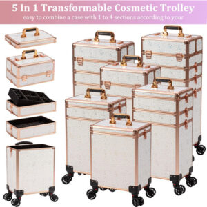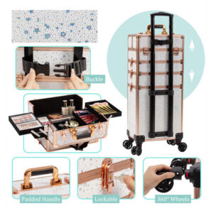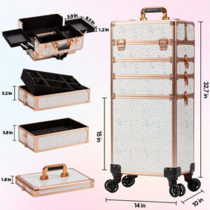 Estojo de cosméticos Rolling Aluminium de vários andares Makeup Trolley Beauty Box With Lock A marca AROUS é uma fábrica especializada na produção de caixas de maquiagem multifuncionais, e esta loja é nossa loja principal. Ao mesmo tempo, também contratamos e produzimos vários estilos de caixas de maquiagem para outras marcas. No ramo de estojos de maquiagem, a caixa de cosméticos 4 em 1 é nosso produto mais vendido. Esta é a nossa caixa de carrinho desenvolvida e projetada de forma independente, que é muito adequada para maquiadores profissionais e estudantes usarem em escolas, salas de maquiagem, bolas de maquiagem e outras ocasiões. Seu grande espaço interno pode acomodar várias ferramentas de maquiagem, como pincéis cosméticos, clipes de sobrancelha, maquiagem de base, loção, modeladores de cabelo, modeladores de cabelo, secadores de cabelo, luminárias de unhas, etc. Nossa caixa de maquiagem tem 4 rodas e 2 rodas. As 4 rodas requerem instalação simples, enquanto as 2 rodas não requerem instalação. Cada um deles tem seus próprios benefícios e você pode escolher de acordo com suas necessidades. A caixa de maquiagem AROUS não só tem uma estrutura robusta e durável, mas também tem um design moderno que facilita arrastar e soltar. Se você quiser saber mais sobre outros aspectos do estojo de cosméticos, entre em contato comigo diretamente e responderemos suas perguntas de forma rápida, paciente e adequada. – Carrinho de cosméticos transformável 5 em 1: o estojo de maquiagem 5 em 1 consiste em 4 compartimentos removíveis e uma tampa separada que pode ser combinada livremente conforme suas necessidades. O compartimento superior pode ser usado como um pequeno estojo de maquiagem; as três gavetas a seguir podem ser removidas para transformar este estojo de maquiagem 5 em 1 em um estojo 3 em 1/2 em 1, de acordo com suas necessidades de trabalho. – Bandeja intermediária de grande capacidade: a bandeja central combina engenhosamente com o defletor removível. De acordo com dispositivos de tamanhos diferentes, o espaço pode ser organizado, não apenas os itens são colocados de forma organizada, mas também podem ser fixados para evitar danos por tremores e quedas. É muito adequado para maquiadores profissionais, manicures, cabeleireiros, esteticistas, estudantes de tecnologia de unhas, tatuadores ou pessoas que usam muitos cosméticos. – Fechável e reforçado: 8 pinças com fechadura para proteger seus itens, 2 chaves incluídas. Cada canto desta maleta de maquiagem está bem protegido com metal e plástico para maior durabilidade e robustez. Os protetores de borda arredondada reforçados com alumínio compartilham a mesma função dos cantos. – Várias formas móveis: nosso estojo de maquiagem para carrinho fica sobre quatro rodas de alta qualidade para um rolamento silencioso e fácil. As rodas removíveis podem ser facilmente removidas ou substituídas, se necessário. A alça deslizante suave com tubo hexagonal inovador garante excelente estabilidade. Alça na parte superior para facilitar o transporte. – Estojo de maquiagem versátil: este elegante estojo de maquiagem para carrinho é uma peça indispensável para profissionais de MUA, manicures, cabeleireiros, esteticistas e estudantes de tecnologia de unhas. Quem possui uma montanha de cosméticos deve ter seu próprio organizador de maquiagem. Além disso, também é um presente impressionante e atencioso para sua família e amigos. – Nota: Ao receber seu pacote, observe que o compartimento superior é colocado no compartimento inferior.