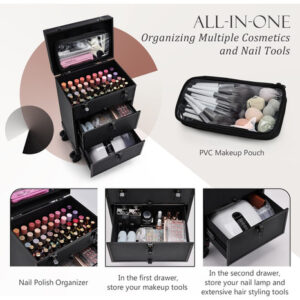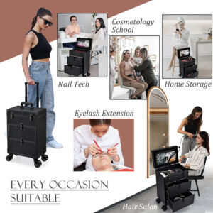 Estojo de maquiagem profissional Rolling Case on Wheels Estojo de unhas de 2 gavetas grandes Trolley Travelling Cosmetic Train Case com bolsa de maquiagem para artistas Nail Technician Salon Cart Baú de couro preto – Estojo de maquiagem profissional de couro preto enrolável: o estojo de maquiagem vem em couro vegano preto com uma moldura de alumínio preto feita especialmente. Alumínio de grau A durável e resistente em todas as estruturas e uma estrutura de alta qualidade para maior durabilidade e proteção. Sua superfície impermeável de couro preto o torna um excelente estojo de cosméticos para uso externo. – Estojo multifuncional Rolling Train: a primeira camada tem uma grande divisória removível que pode segurar o esmalte na posição vertical ou armazenar grandes suprimentos de beleza com a divisória removida. Com dispositivos de tamanhos diferentes, você pode organizar o espaço, não apenas itens bem colocados, e evitar que danos tremam e caiam. Uma bolsa de maquiagem é fixada na tampa superior, que pode conter mais pincéis e acessórios. – 2 gavetas deslizantes grandes. Baú de cosméticos: o tamanho de cada gaveta é 11,38 x 8,27 x 5,11 polegadas, que tem um trilho deslizante liso para estender e fechar, mas não desliza para fora quando não estiver em uso, pois a conexão é estável. O fundo de 2 gavetas grandes oferece excelente armazenamento para cosméticos, suprimentos para unhas e extensas ferramentas de modelagem de cabelo. É ideal para maquiadores, cabeleireiros, manicures, tatuadores e qualquer outra pessoa que tenha uma montanha de cosméticos. – Suave e segura: há quatro rodas giratórias de 360 graus de alta qualidade neste estojo de maquiagem rolante. Um movimento suave e silencioso é obtido, bem como benefícios de economia de mão de obra. Para manter a caixa estável, cada roda tem a capacidade de ficar parada. As rodas removíveis podem ser facilmente removidas ou substituídas, se necessário. – Estojo portátil de viagem para cabeleireiro: as dimensões do estojo de maquiagem são 13,8 x 9,05 x 22,5 polegadas. A haste de tração se estende por até 38 polegadas, proporcionando uma altura de trabalho adequada e confortável. Para garantir a privacidade, cada camada pode ser bloqueada com uma chave. A solução ideal para levar exatamente o que você precisa, onde quer que esteja, quando quiser. – Melhor presente: um carrinho de maquiagem ideal para enrolar para manter sua penteadeira limpa e arrumada. O design clássico o torna um excelente presente para guardar muitas boas lembranças. Para escolas de cosmetologia, escolas de tecnologia de unhas, salões de beleza, estilistas móveis, organizadores de casamentos ou aqueles com muitos suprimentos, essa é uma excelente escolha.