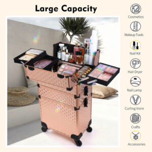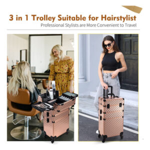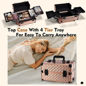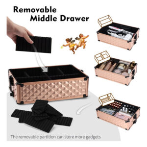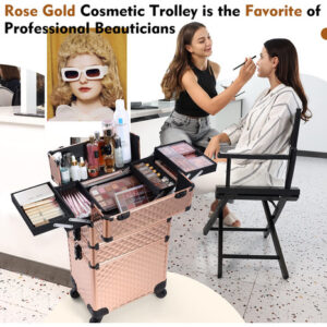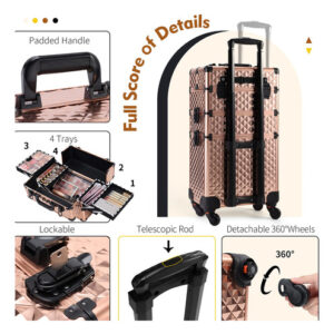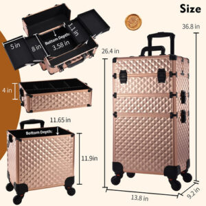 Características: Este tamanho do estojo de maquiagem rolante Frenessa é 13,8 x 9,2 x 26,4 polegadas. A haste de tração com altura totalmente estendida pode chegar a 36,8. O carrinho de maquiagem 3 em 1 consiste em 3 compartimentos removíveis que podem ser combinados livremente conforme suas necessidades. A bandeja central é engenhosamente combinada com o defletor removível. Esta maleta de trem é equipada com quatro rodas giratórias de 360 graus de alta qualidade, proporcionando um movimento suave e silencioso, economizando mais mão de obra. Especificações: Material: alumínio de grau A Tamanho: 13,8 x 9,2 x 26,4 polegadas. Cor: Vintage Rose Gold Conteúdo da embalagem: 1 x estojo de maquiagem vintage Rose Gold Rolling Nota: pincéis de maquiagem e outros acessórios cosméticos não estão incluídos, apenas para referência. – Estojo de maquiagem portátil Rolling Este tamanho do estojo de maquiagem rolante Frenessa é 13,8 x 9,2 x 26,4 polegadas. A altura totalmente estendida da haste de tração pode chegar a 36,8, altura adequada e confortável de usar. Carrinho de maquiagem rolante com alumínio reforçado de grau A em todas as armações e uma estrutura de alta qualidade para maior durabilidade e proteção. Também pode ser trancado com chaves para privacidade. 6 braçadeiras com fechadura para proteger seus itens, 2 chaves estão incluídas. – Carrinho de cosméticos transformável 3 em 1 O carrinho de maquiagem 3 em 1 consiste em 3 compartimentos removíveis que podem ser combinados livremente conforme suas necessidades. O compartimento superior pode ser usado como um pequeno estojo de maquiagem; as gavetas do meio podem ser removidas para transformar este estojo de maquiagem 3 em 1 em um estojo 2 em 1, de acordo com suas necessidades de trabalho. – Bandeja central de grande capacidade: a bandeja central combina engenhosamente com o defletor removível. De acordo com dispositivos de tamanhos diferentes, o espaço pode ser organizado, não apenas os itens são colocados de forma organizada, mas também podem ser fixados para evitar danos por tremores e quedas. É muito adequado para maquiadores profissionais, manicures, cabeleireiros, esteticistas, estudantes de tecnologia de unhas, tatuadores ou pessoas que usam muitos cosméticos. – Rodas giratórias removíveis Esta maleta de trem é equipada com quatro rodas giratórias de 360 graus de alta qualidade, proporcionando movimentos suaves e silenciosos, economizando mais trabalho. As rodas removíveis podem ser facilmente removidas ou substituídas, se necessário. Ideal para levar exatamente o que você precisa, em qualquer lugar, a qualquer hora. – Portátil para ela: um porta-malas de maquiagem ideal para manter sua cômoda limpa e arrumada. É elegante o suficiente para guardar muitas boas lembranças. É muito adequado para maquiadores profissionais, manicures, cabeleireiros, esteticistas, manicures, tatuadores ou pessoas com montanhas de cosméticos.