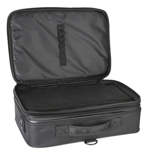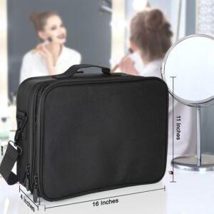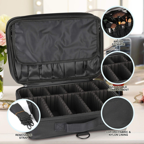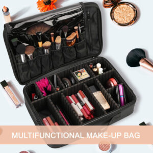 Esta bolsa de maquiagem é feita de tecido Oxford de alta qualidade, forro de nylon. Oferece bastante espaço de armazenamento suficiente para armazenar e transportar seus acessórios de maquiagem e cosméticos, como batom, brilho labial, pincéis de maquiagem, sombra para os olhos, paletas de maquiagem de vários tamanhos, escovas de cabelo, produtos para a pele, esmaltes, ferramentas de arte de unhas, xampus e cremes. Esta bolsa de maquiagem tem vários compartimentos e compartimentos para pincéis de maquiagem. Você pode remover e ajustar facilmente o tamanho de cada compartimento no sentido do comprimento e da largura, a fim de obter o espaço de armazenamento mais eficiente e manter suas ferramentas de maquiagem em ordem e higiene. Sua profundidade de 4,5 oferece a possibilidade de manter seus batons e lápis na horizontal e economizar ainda mais espaço. O compartimento lateral da escova acomoda várias escovas e ferramentas com a aba de velcro para mantê-la no lugar e protegê-la. Design portátil e leve, com características interiores impermeáveis, à prova de choque, antidesgaste e à prova de derramamento, fazem desta a bolsa de maquiagem de viagem perfeita. Agora você pode levar seus cosméticos para qualquer lugar. Esta bolsa de maquiagem é multiuso, não só pode armazenar seus cosméticos, mas você pode organizar e transportar joias, acessórios eletrônicos, câmera, óleo essencial, produtos de higiene pessoal, kit de barbear e qualquer coisa que considere valiosa e importante para sua viagem. Aproveite! – MATERIAL PREMIUM: Esta bolsa de maquiagem é feita de tecido Oxford de alta qualidade e forro de nylon. (Nota: acessórios cosméticos não incluídos). – FLEXIBILIDADE: escolha entre três tamanhos diferentes para obter espaço suficiente em uma bolsa de maquiagem compacta. Armazene batom, brilho labial, pincéis de maquiagem, sombras, paletas de maquiagem, escovas de cabelo, produtos para a pele, esmaltes, ferramentas de arte para unhas, xampus e cremes em uma única capa! – COMPARTIMENTOS AJUSTÁVEIS: as divisórias ajustáveis criam compartimentos personalizados para oferecer espaço suficiente para guardar seus acessórios de maquiagem e cosméticos perfeitamente separados. – Estojo de maquiagem de viagem perfeito: design leve e portátil, abre totalmente com zíper versátil. Interiores impermeáveis, à prova de choque, antidesgaste e à prova de derramamento. Alça durável. Perfeita para maquiadores viajantes. — Bolsa de maquiagem multifuncional: esta bolsa de maquiagem também pode armazenar joias, acessórios eletrônicos, câmera, óleos essenciais, produtos de higiene pessoal, kit de barbear, objetos de valor e muito mais.