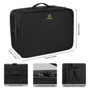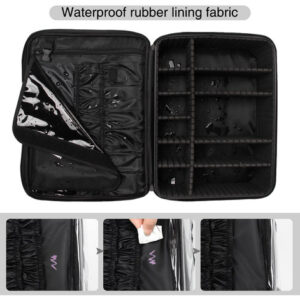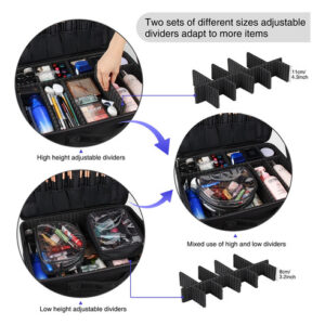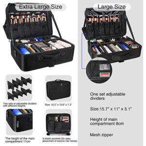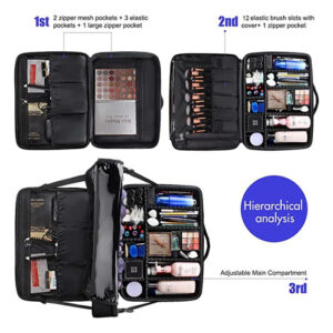 Cor: preto Materiais: couro PU e forro de náilon. O pacote inclui: 1 estojo de maquiagem, 10 divisórias — MAIS MAIORES: as fendas elásticas podem armazenar coisas como pentes e cortadores de unhas. Um pequeno bolso com zíper pode armazenar coisas planas, como máscaras faciais e lenços umedecidos. O grande pode armazenar uma série de paletas de sombras. A segunda camada tem quatorze fendas elásticas para escovas com capa e bolso com zíper. Cada ranhura do pincel pode armazenar um pincel grande e dois pincéis pequenos. O bolso grande pode armazenar uma grande paleta de sombras. A sala principal está cheia o suficiente para armazenar uma série de cosméticos de todos os tamanhos. – RANHURAS ESPECIAIS PARA ESCOVAS: todas as ranhuras para escovas têm elasticidade total para diminuir a mobilidade das coisas que estão dentro dela. Ele pode armazenar pincéis de todos os tamanhos e tipos. Além de armazenar pincéis, os lápis também podem ser armazenados nele. A tampa da escova é usada para proteger a cabeça da escova. É um material resistente à água e ao pó. Quando colocado pó, pode ser facilmente limpo. – DIVISÓRIAS AJUSTÁVEIS: O compartimento principal tem dois grupos de divisórias, baixas e altas. Os divisores podem classificar os cosméticos, torná-los mais ordenados. Também facilite o acesso aos cosméticos. Em situações normais, você pode escolher os divisores de grupo altos ou os divisores baixos. Ou você pode combinar duas delas para classificar suas maquiagens e cosméticos. – ALÇA DE OMBRO DUPLA: uma alça de ombro pode levar a bolsa no ombro, mas é muito pesada. Duas alças podem fazer com que a bolsa se encaixe em dois ombros para reduzir o peso de cada ombro. – MULTIFUNCIONAL: a bolsa de maquiagem não é usada apenas para guardar cosméticos. Ele também pode armazenar itens como produtos digitais, joias e outros.