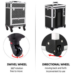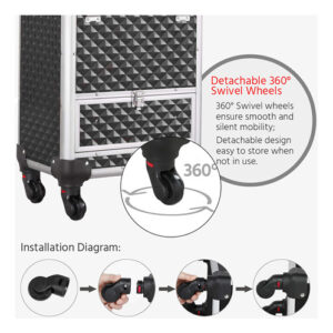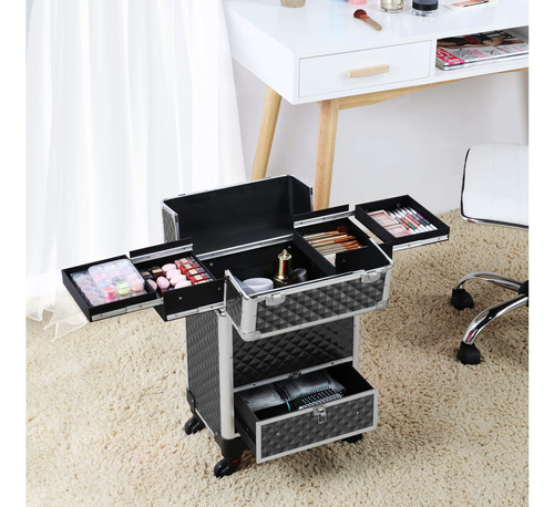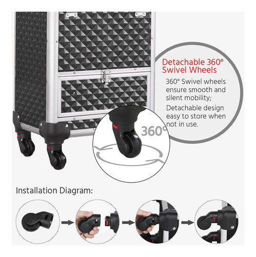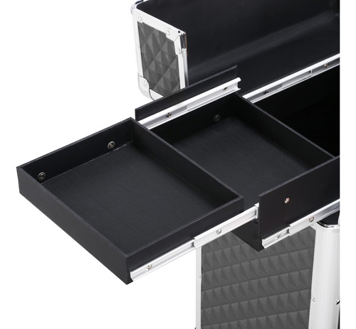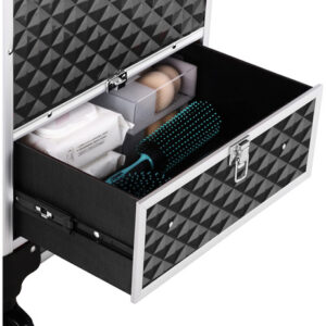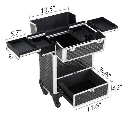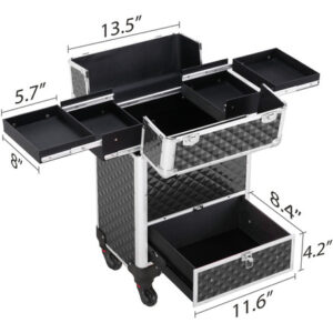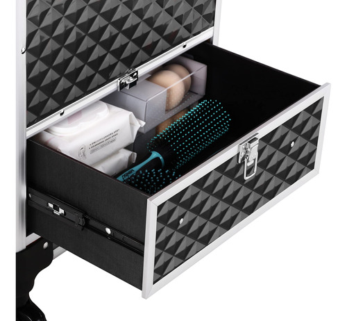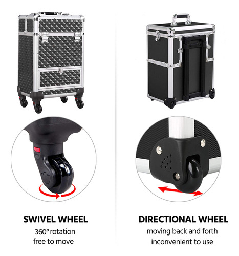 Este estojo de cosméticos de várias camadas foi projetado para ajudar você a manter cosméticos e ferramentas de maquiagem de vários tipos limpos e acessíveis. Possui 4 bandejas retráteis equipadas com trilhos deslizantes de alumínio antiferrugem e duráveis para uma operação extremamente suave. O grande armazenamento superior pode guardar ferramentas de cabelo, como secador de cabelo, alisador de cabelo, modelador de cabelo e outros cosméticos de tamanho relativamente grande. A gaveta inferior pode conter máscaras faciais, escovas de cabelo e garrafas curtas. Rodas giratórias multidirecionais removíveis tornam este estojo de maquiagem para carrinho conveniente de transportar. O estilo minimalista e o hardware brilhante o tornam uma peça atraente entre todos os estojos de cosméticos. Especificações: – Material: superfície da caixa de plástico ABS e borda de alumínio e MDF e metal e forro de poliéster 210D e haste de tração de alumínio e roda de borracha – Dimensão da caixa (altura da roda incluída): 13,5 x 9,5 x 21,9 (CxLxA) – Alça de tração máxima. Altura: 39,4 – Tamanho da bandeja retrátil: 7,3 x 5,7 x 1,4; 8 x 5,7 x 1,4 (CxLxA) – Tamanho interno do compartimento superior: 12,7 x 9 x 8,7 (CxLxP) – Tamanho interno da gaveta inferior: 10,6 x 8,3 x 3,9 (CxLxP) – Máx. Capacidade de carga: 22 lb – G.W.: 16,7 lb – N.W.: 13,9 lb – Tamanho da embalagem: 15,9 x 13,4 x 23,2 (CxLxA) – APARÊNCIA ENCANTADORA COM USO PRÁTICO: O ABS de alta qualidade tem ótimo desempenho em resistência à abrasão e é caracterizado por sua leveza e durabilidade. Estilo minimalista contemporâneo combinado com padrão argyle em relevo e superfície de ABS brilhante, este estojo de maquiagem não é apenas uma ferramenta prática, mas também um acessório moderno. – Material: superfície da caixa de plástico ABS e borda de alumínio e MDF e metal e forro de poliéster 210D e tirante de alumínio e roda de borracha – SEGURO E SEGURO: dois grampos com fechadura na parte superior para proteger seus itens, 2 chaves estão incluídas. Cada canto desta maleta de maquiagem está bem protegido com metal e plástico para maior durabilidade e robustez. As bordas arredondadas reforçadas com alumínio compartilham a mesma função dos cantos. – Portabilidade conveniente Equipada com quatro rodas de 360 graus, esta maleta cosmética garante um rolamento suave, estável e silencioso em todas as direções. A alça telescópica de alumínio 39,5 para na altura certa para um puxão confortável. – Robusto e durável. Este estojo de maquiagem é feito com um verniz de plástico à prova d'água, reforçado com bordas e cantos de alumínio e metal. O forro durável de poliéster 210D é resistente ao desgaste, junto com ferragens de metal pesadas.