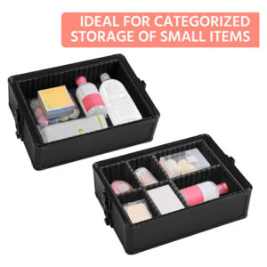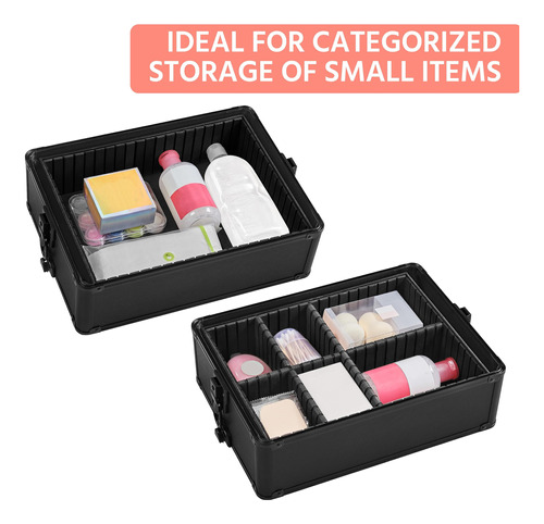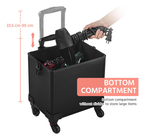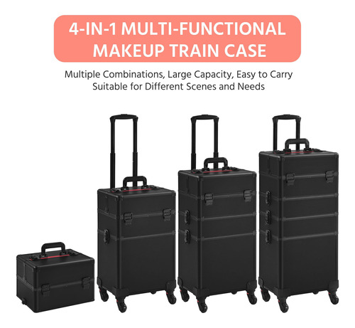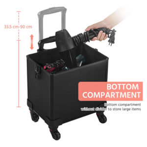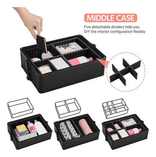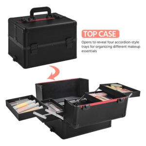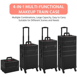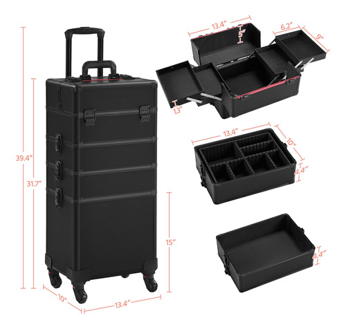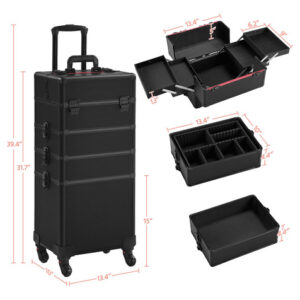 O estojo de maquiagem Yaheetech Trolley oferece espaços de armazenamento exclusivos para itens de diferentes tipos e tamanhos – 4 bandejas laterais em estilo acordeão projetadas para itens pequenos, como esmaltes, batons, etc.; uma bandeja forrada de espuma com divisórias fornece acessórios delicados e garrafas de vidro com uma solução de armazenamento segura; o compartimento inferior sem divisão é espaçoso para chapinhas, garrafas longas/grandes, cabeça de manequim e outros itens de tamanho relativamente grande. Este carrinho de maquiagem 4 em 1 pode ser transformado em um estojo 3 em 1 em um estojo de trem 2 em 1 simplesmente removendo as camadas. Você pode ter o benefício de 3 opções de estojo: um estojo 3 em 1, um estojo 2 em 1 e um estojo superior separado. Rodas giratórias multidirecionais removíveis tornam este estojo de maquiagem para carrinho conveniente de transportar. O design minimalista e o estilo chique fazem com que ele se destaque de todos os estojos de cosméticos do mercado. Estojo de maquiagem profissional esteticamente agradável com funções poderosas, não perca! Especificações: – Material: folheado de PVC e borda de alumínio e caixa de MDF e forro de poliéster 210D e haste de tração de alumínio e roda de plástico e hardware de metal – Dimensão da caixa (altura da roda incluída): 13,4 x 10 x 31,7" (CxLxA) – Altura da alça retrátil: 17-39,5” – Tamanho da caixa superior: 13,4 x 9,8 x 8,9" (CxLxA) – Tamanho da bandeja em estilo acordeão: 9 x 6,2 x 1,4" (CxLxA) – Tamanho médio da gaveta (cada): 13,4 x 9,8 x 4,1" (CxLxA) – Tamanho do compartimento inferior: 13,4 x 9,8 x 11,8" (CxLxA) – Tamanho da bandeja removível: 12 x 9 x 3,2" (CxLxA) – G.W.: 20,2 libras – N.W.: 16,2 1 kg – Cor: preto O pacote inclui: 1 x Estojo cosmético NOTA: 1. Cosméticos, ferramentas de penteado e ferramentas de maquiagem não estão incluídos neste item 2. Nota: Permita erros devido às medidas manuais — Solução perfeita para armazenamento de maquiagem. 4 bandejas laterais em estilo acordeão foram projetadas para itens pequenos, como esmaltes e batons. Uma bandeja de revestimento de espuma com divisórias fornece acessórios delicados e garrafas de vidro com uma solução de armazenamento segura. O compartimento inferior sem divisão é espaçoso para chapinhas planas/onduladas, garrafas longas/grandes, cabeça de manequim, etc. – Estojo de carrinho de maquiagem transformável O estojo de maquiagem 4 em 1 consiste em 4 compartimentos removíveis que podem ser combinados livremente conforme suas necessidades. O compartimento superior pode ser usado como um pequeno estojo de maquiagem; as duas gavetas centrais podem ser removidas para transformar este estojo de maquiagem 4 em 1 em um estojo 3 em 1/2 em 1, de acordo com suas necessidades de trabalho. – Fechável e reforçado. 8 braçadeiras com fechadura para proteger seus itens, 2 chaves estão incluídas. Cada canto desta maleta de maquiagem está bem protegido com metal e plástico para maior durabilidade e robustez. Os protetores de borda arredondada reforçados com alumínio compartilham a mesma função dos cantos. – Várias formas móveis. Nosso estojo de maquiagem para carrinho fica sobre quatro rodas de alta qualidade para um rolamento silencioso e fácil. As rodas removíveis podem ser facilmente removidas ou substituídas, se necessário. A alça deslizante suave com tubo hexagonal inovador garante excelente estabilidade. Alça na parte superior para facilitar o transporte. – Estojo de maquiagem versátil. Este elegante estojo de maquiagem para carrinho é uma peça indispensável para profissionais de MUA, manicures, cabeleireiros, esteticistas e estudantes de tecnologia de unhas. Quem possui uma montanha de cosméticos deve ter seu próprio organizador de maquiagem. Além disso, também é um presente impressionante e atencioso para sua família e amigos.