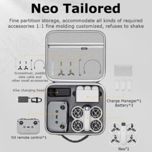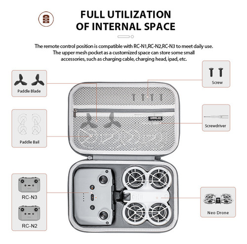 1. Forte compatibilidade. Projetada especialmente para o DJI NEO, esta bolsa de armazenamento se encaixa no dispositivo com precisão e oferece armazenamento perfeito. É compatível com aeronaves NEO e controle remoto RC-N3 (compatível com RC-N2), atendendo às necessidades diárias. O bolso de malha na página anterior pode ser usado como um espaço personalizado para armazenar alguns acessórios relacionados, como fios de carregamento, cabeças de carregamento, etc