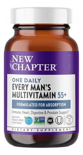 O multivitamínico New One Daily da New Chapter para homens com mais de 50 anos, formulado por especialistas com vitaminas, minerais e ervas para manter sua vitalidade nesta fase dinâmica da vida. Every Mans One Daily 55+ é fermentado com probióticos e alimentos integrais e é facilmente digerível, suave o suficiente para ser tomado a qualquer momento, mesmo com o estômago vazio. Nutra seu corpo e apoie o sistema imunológico, cardíaco, energético, ocular, prostático, cerebral e digestivo com este exclusivo multivitamínico masculino.* SEM FERRO.