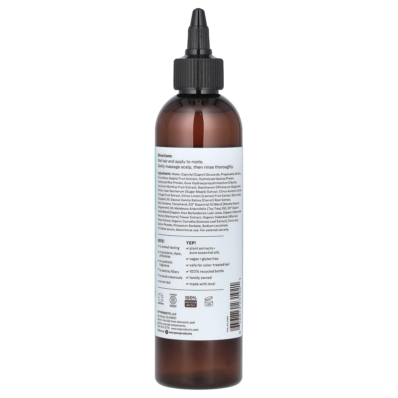 Água, caprylyl/capryl glucosídeo, propanodiol, betaína, extrato da fruta de Pyrus malus (maçã), proteína de quinoa hidrolisada, proteína de arroz hidrolisada, cloreto de guar hydroxypropyltrimonium, extrato da fruta de Vaccinium myrtillus, extrato de Saccharum officinarum (cana-de-açúcar), extrato de Acer saccharum (bordo-açucareiro), extrato da fruta de Citrus aurantium dulcis (laranja), extrato do fruto de Citrus limon (limão), óleo de Glycine soja (soja), extrato da raiz de Daucus carota sativa (cenoura), betacaroteno, tocoferol, mistura de óleos essenciais eo® [óleo de Mentha piperita (hortelã-pimenta), óleo de Maleleuca alternifolia (melaleuca)], mistura de ervas orgânicas eo® [suco da folha de Aloe barbadensis orgânico, extrato da flor de Chamomilla recutita (matricária) orgânica, extrato da flor de Calendula officinalis orgânica, extrato orgânico da folha de Camellia sinensis], ácido cítrico, fitato de sódio, sorbato de potássio, levulinato de sódio.