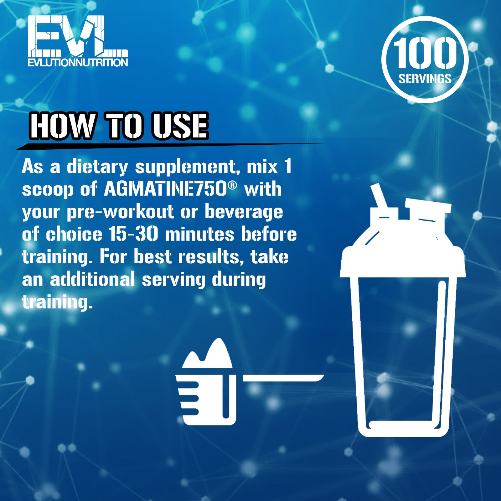 Como suplemento alimentar, misture 1 colher medidora de Agmatine750® com o pré-treino ou bebida de sua escolha de 15 a 30 minutos antes do treino. Para obter melhores resultados, tome uma porção adicional durante o treino.
