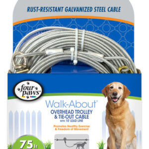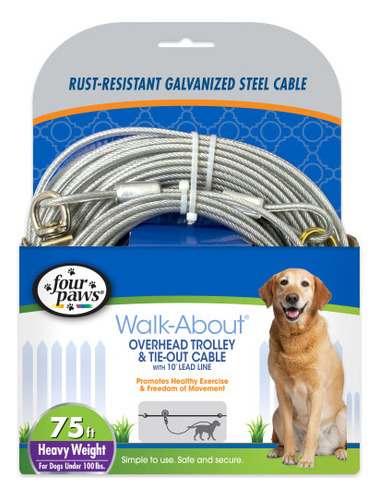 Não deixe seu filho peludo se sentir preso! Sem cerca? Sem problemas! Deixe seu cão passear com segurança ao ar livre com o cabo Four Paws Heavy Weight Dog Run! Este cabo de amarração para cães permite que seu filho peludo fareje, faça exercícios e explore o ar livre, mantendo-se seguro e contido. O cabo de corrida para cães à prova de ferrugem é feito de cabo durável para aeronaves e inclui uma polia de 10 pés. Um cabo para cães grandes, perfeito para quintais grandes e cães com mais de 50 libras. Cabo para cães ao ar livre feito de cabo de aeronave durável revestido de vinil. A gravata para cães de longa duração e à prova de ferrugem não se desgasta. Dá liberdade, segurança e exercícios ao seu cão. Mede 100 pés de comprimento. O cabo para cães para quintal foi projetado para cães com mais de 50 libras.