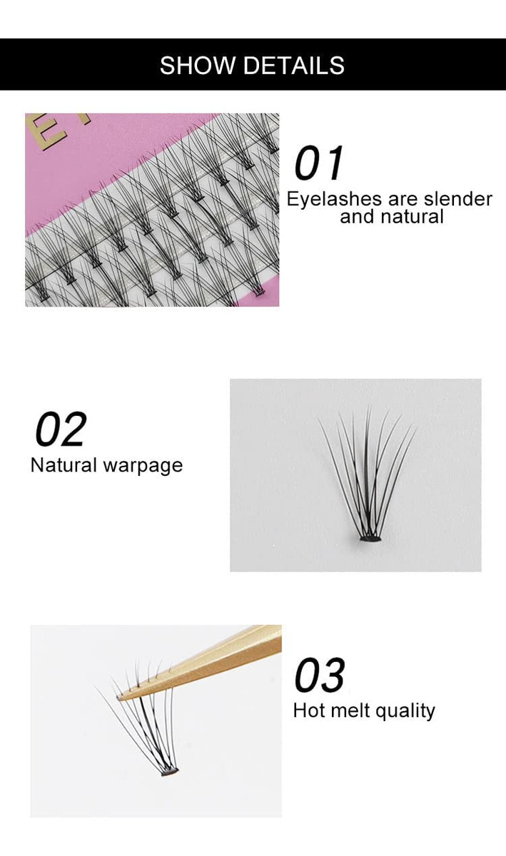1. Especificações: Ventilador pré-fabricado de haste curta Extensor de extensão de cílios de estilo russo 20 ventiladores por linha, 3/7 linhas por bandeja, 3 linhas cada com um total de 60 ventiladores, 7 fileiras cada uma com 140 ventiladores. A 7ª fila tem comprimento misto. 2. Muito macia e leve, com aparência e toque naturais. O acabamento em preto fosco proporciona uma aparência mais bonita com leveza especial. 3. Ventiladores de extensão de cílios de volume feitos à mão, unidos termicamente com uma base muito leve, fáceis de aplicar e podem fazer com que se misturem melhor com a cola, tornando o efeito mais natural e leve. 4. Esses cílios pré-fabricados de caule curto podem ser usados tanto por artistas iniciantes quanto experientes. 5. Se você não gosta de nossos produtos, não se preocupe, entre em contato conosco, faremos o melhor solução. – 1. Especificações: Ventilador pré-fabricado de haste curta Extensor de extensão de cílios de estilo russo 20 ventiladores por linha, 3/7 linhas por bandeja, 3 linhas cada com um total de 60 ventiladores, 7 fileiras cada uma com 140 ventiladores. A 7ª fila tem o comprimento misto. – 2. Muito macia e leve, com aparência e toque naturais. O acabamento em preto fosco deixa a aparência mais bonita com leveza especial. – 3. Ventiladores de extensão de cílios volumosos feitos à mão, unidos termicamente com uma base muito leve, fáceis de aplicar e podem fazer com que se misturem melhor com a cola, tornando o efeito mais natural e leve. – 4. Esses cílios pré-fabricados de caule curto podem ser usados tanto por artistas iniciantes quanto experientes. – 5. Se você não gosta de nossos produtos, não se preocupe, entre em contato conosco, entre em contato conosco, fará a melhor solução. – Tipo de tecido: fibra