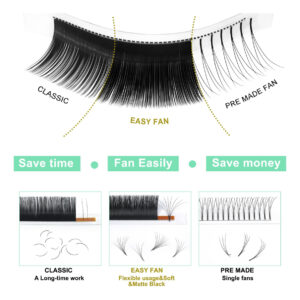 Extensões de cílios de volume D-0,07-14 Easy Fan Volume Lashes Extensões de cílios floridos Extensões de cílios de floração rápida Extensões de cílios de mega volume 9 a 20 mm C D curl (D-0,07,14 mm) – Extensões de cílios de volume: cílios Easy Fan disponíveis em: 0,03/0,05/0,07/0,10 Curl: CC/C/D/DD, 9 a 20 mm e mistura 9-16, 15-20 mistura, comprimento de mistura de 20-25. 12 fileiras de extensões de cílios podem atender adequadamente às suas necessidades. – Técnicas especiais: a extensão de cílios pode reduzir o tempo de ajuste de volume. A faixa de extensão de cílios pegajosa evita que os cílios volumosos se separem na base para ajudar você a criar cílios fofos perfeitos em segundos. – Cílios duráveis: nossos cílios fáceis de ventilar podem florescer automaticamente e estabilizar o ventilador. A curvatura da extensão dos cílios permanecerá pelo menos 12 meses. Além disso, não haveria excesso de cola na base da extensão dos cílios. – Preto e macio: o volume das extensões de cílios pode ser usado por ventiladores 2D-10D para extensões de cílios. Adequado para todos os conjuntos de extensões de cílios com menos dinheiro. O material PTB preto torna as extensões dos cílios pretas foscas, macias e tão naturais quanto os cílios reais das pessoas. – Garantia e serviço pós-venda. Se houver alguma coisa em que possamos ajudá-lo, envie-nos uma mensagem e forneceremos respostas e soluções rápidas. Obrigado por comprar conosco!