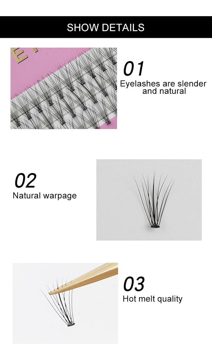 [Forma única do tipo A] A ponta superior e a largura inferior dos cílios são em forma de A, o triângulo está firmemente apoiado e a forma é duradoura. [Aprimoramento visual da maquiagem] Podem ser enxertados ou embelezados por enxerto, os efeitos da maquiagem são frescos e atraentes, com um estilo de fada forte e adorável. [Dois métodos de enxerto] Ele pode ser enxertado sozinho ou pode ser baseado em cílios com vários pêlos e decorado em forma de A para um efeito excepcional. [Curvatura de longa duração] Processo de ondulação em alta temperatura, ondulação de longa duração, sem deformação. [Comprimento] 3 linhas: 8-14 mm – [Forma única do tipo A] A ponta superior e a largura inferior dos cílios são em forma de A, o triângulo está firmemente apoiado e a forma é duradoura. – [Aprimoramento visual da maquiagem] Pode ser enxertado ou embelezado por enxerto, os efeitos da maquiagem são frescos e atraentes, com um estilo de fada forte e adorável. – [Dois métodos de enxerto] Pode ser enxertado sozinho, ou pode ser baseado em cílios com vários pêlos e decorado em forma de A para um efeito excepcional. – [Curvatura de longa duração] Processo de ondulação em alta temperatura Curvatura de longa duração, sem deformação. – [Comprimento] 3 linhas: 8-14mm