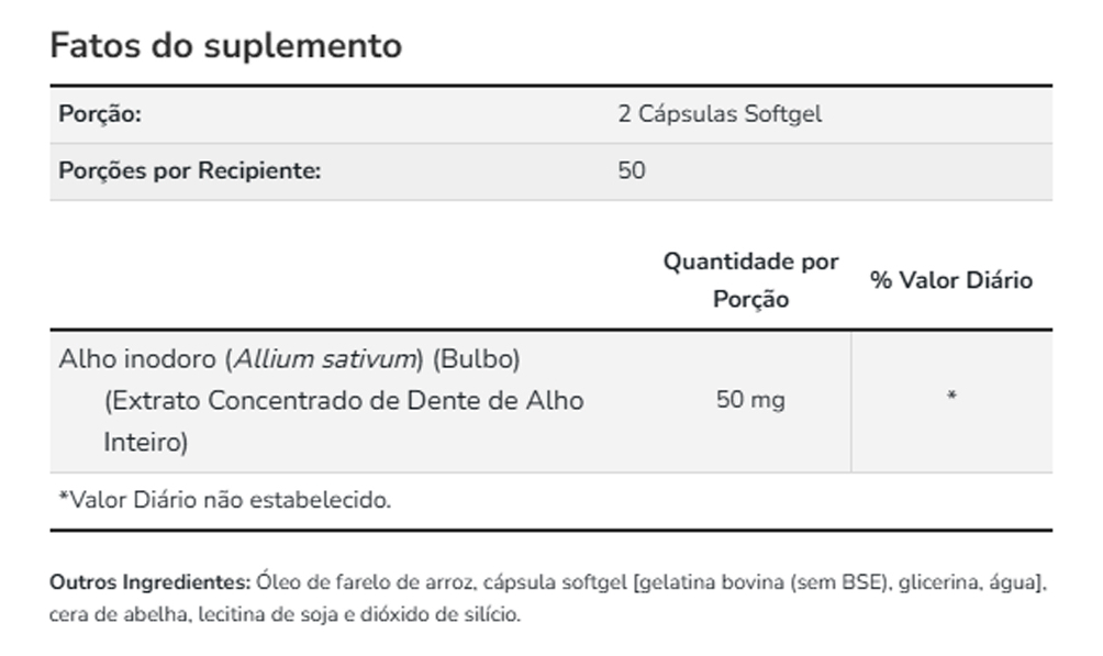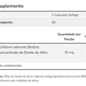 Sua composição utiliza o dente de alho inteiro em um extrato concentrado, garantindo uma fórmula natural e eficiente. Cada softgel contém ingredientes selecionados para atender a necessidades específicas. Validade longa