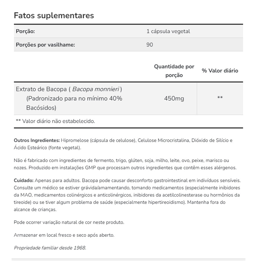 5. Composição com Extrato de Bacopa Puro: Cada cápsula contém 450mg de extrato de Bacopa de alta qualidade. A escolha deste ingrediente visa maximizar a eficácia da formulação, mantendo a integridade e a pureza do extrato. Validade longa