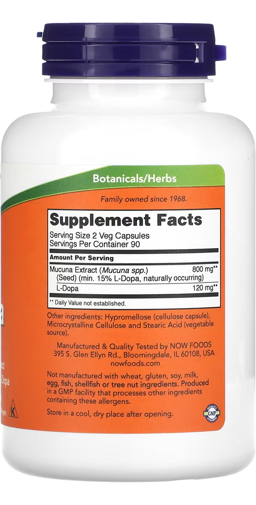 Extrato de Dopa Mucuna Now Foods 180 Veg Caps Produto Importado