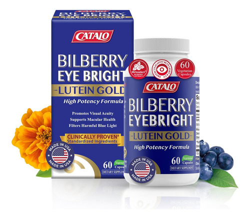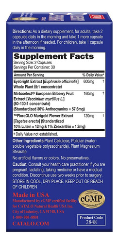Ingredientes: extrato de mirtilo europeu (concentrado 100:1) (padronizado: 36% de antocianinas/25% de antumina) Cianidinas), extrato de calêndula FloraGLO (5% de luteína e zeaxantina padronizados), extrato natural de brilho para os olhos, pululano (polissacarídeo vegetal solúvel em água), maltodextrina, celulose,