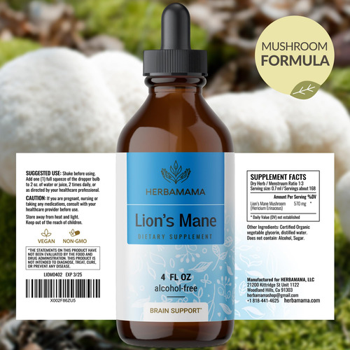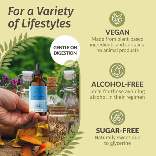 • Para uma variedade de estilos de vida: A fórmula vegana da Herbamama é baseada em glicerina vegetal e não contém álcool ou açúcar. Nossas gotas concentradas para adultos com extrato de cogumelo juba de leão são isentas de glúten, não OGM e livres de corantes ou sabores artificiais.