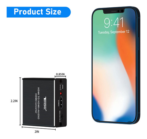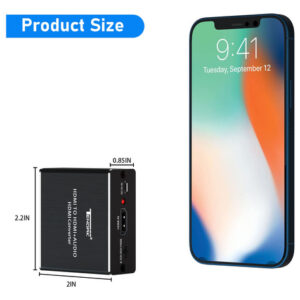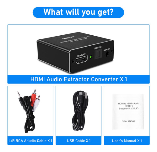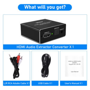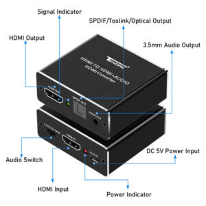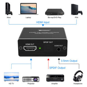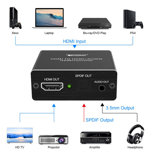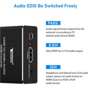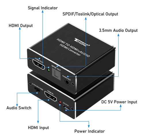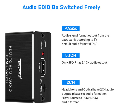 Conversor extrator de áudio estéreo Tendak 4K x 2K HDMI e conversor extrator de áudio estéreo TOSLINK SPDIF + de 3,5 mm Adaptador divisor de áudio HDMI (entrada HDMI + digital/analógica) – Uma entrada HDMI para uma saída HDMI (modo Pass), saída de áudio digital SPDIF (óptica) (modo 2CH/5.1CH) e saída de áudio estéreo de 3,5 mm (modo 2CH); vem Cabo de áudio estéreo de 3,5 mm para RCA. NÃO suporta assento de cabeça astro — o áudio SPDIF e L/R suportam a saída separadamente do amplificador sem conectar TV/monitor; resolução de entrada de até 4K x 2K, 1080P/60Hz, 3D/24Hz. Para alguns dispositivos com portas HDMI de baixa potência (como PS4, PS4 Slim e outros dispositivos Sony), use o ADAPTADOR DE TELEFONE para carregá-lo (basta vir com cabo USB) – Suporta 24 bits/cores profundas de 30 bits, 36 bits por canal (36 bits em todos os canais); suporta passagem de EDID de vídeo, configurações de EDID de áudio: Pass, 2CH e 5.1CH – A saída de áudio de 3,5 mm suporta áudio estéreo PCM de 2 canais somente. A saída SPDIF suporta PCM de 2 canais, Dolby Digital de 5,1 canais, DTS. O extrator de áudio HDMI emitirá o formato de áudio Dolby True-HD, DTS-HD, AC3, DTS, DSD, mas não pode decodificar esses formatos de áudio. Se seu amplificador ou barra de som não suportar esses formatos de áudio, não haverá áudio em sua barra de som ou amplificador, então defina o formato de áudio na fonte HDMI para o formato de áudio PCM/LPCM. – Adequado para vários dispositivos de fonte HDMI, como Roku ou Chromecast, sem saída de áudio dedicada, bem como reprodutor de Blu-ray/DVD/HD, caixa de cabo/satélite, Amazon Fire TV, Apple TV, PS3/4, Xbox, PC /laptop, câmera HD, HD DVR etc