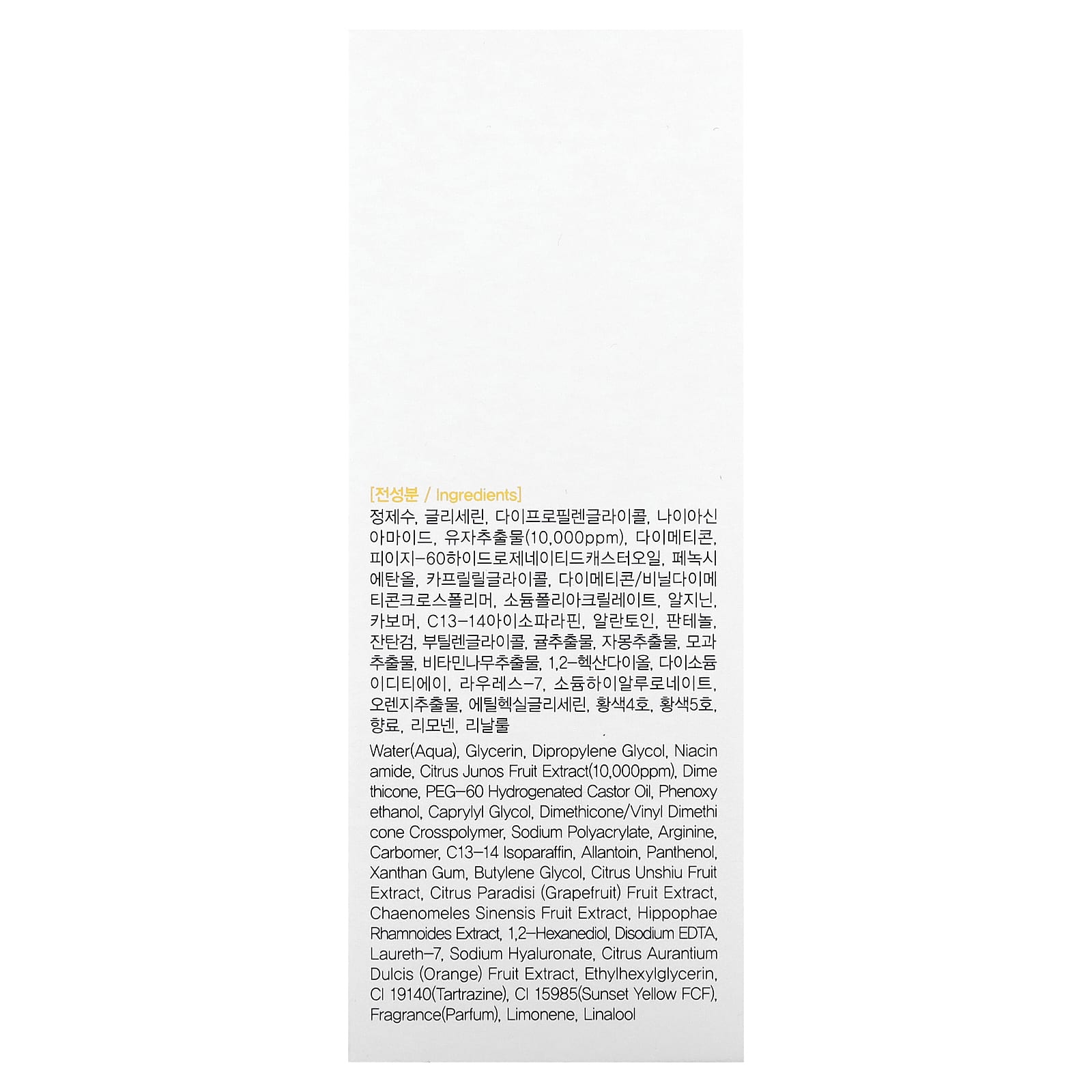 Água (aqua), glicerina, dimetildietilenoglicol, nicotinamida, extrato da fruta Citrus junos (10.000 ppm), dimeticona, óleo de rícino hidrogenado peg-60, fenoxietanol, caprylyl glycol, dimethicone/vinyl dimethicone crosspolymer, sodium polyacrylate, arginina, carbômer, isoparafina c13-14, alantoína, pantenol, goma xantana, butilenoglicol, extrato de fruta cítrica unshiu, extrato da fruta de Citrus paradisi (toranja rosa), extrato da fruta de Chaenomeles sinensis, extrato de Hippophae rhamnoides, 1,2-hexanediol, edetato dissódico, laureth-7, hialuronato de sódio, extrato da fruta de Citrus aurantium dulcis (laranja), ethylhexylglycerin, CI 19140 (tartrazina), CI 15985 (amarelo pôr do sol fcf), fragrância (perfume), limoneno, linalool.