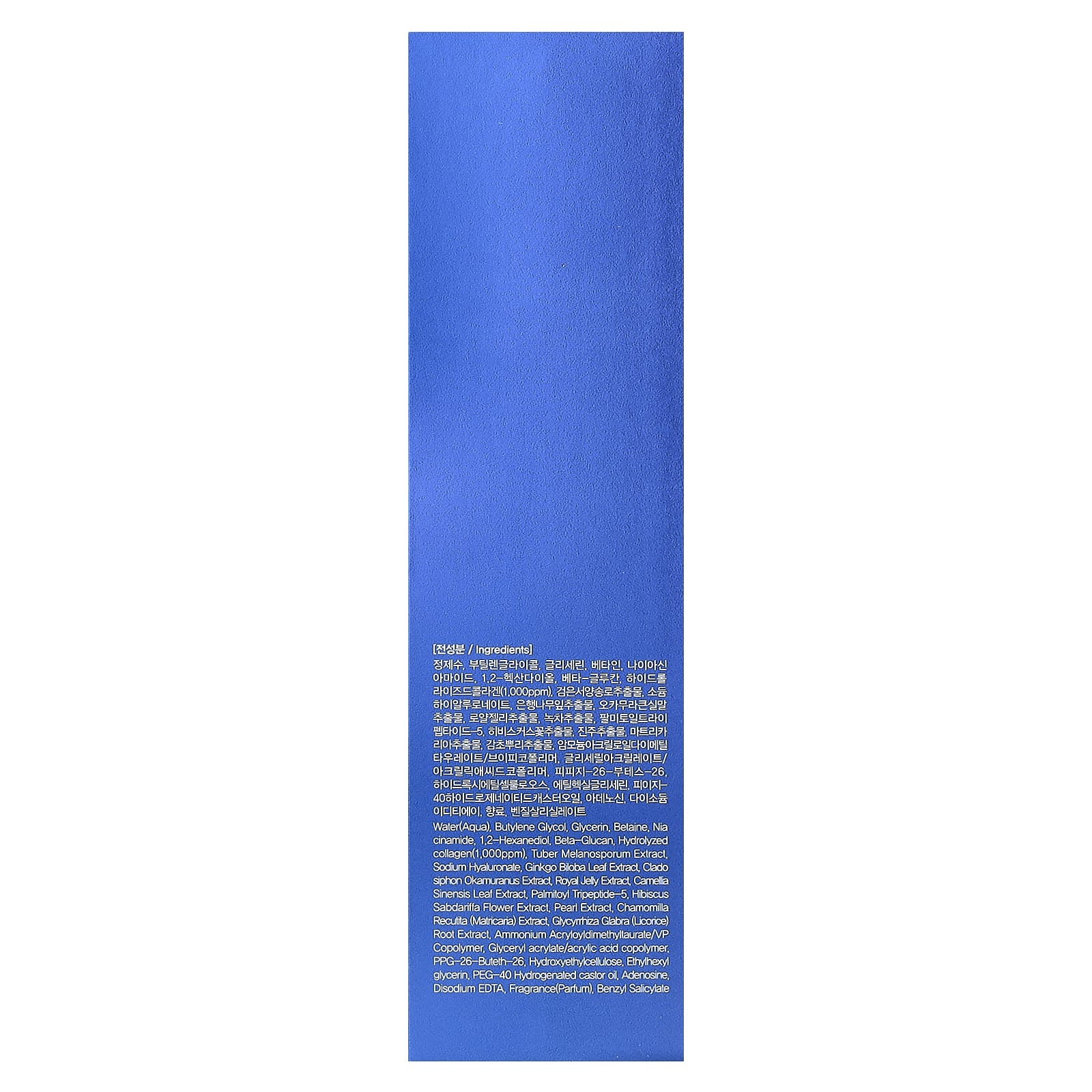 Água, butylene glycerin, glicerina, betaína, nicotinamida, 1,2-hexanediol, beta-glucan, colágeno hidrolisado (1.000 ppm), extrato de Tuber melanosporum, hialuronato de sódio, extrato da folha de Ginkgo biloba, extrato de Cladosiphon okamuranus, extrato de geleia real, extrato da folha de Camellia sinensis, palmitoyl tripeptide-5, extrato da flor de Hibiscus sabdariffa, extrato de pérolas, extrato de Chamomilla recutita (matricária), extrato da raiz de Glycyrrhiza glabra (alcaçuz), ammonium acryloyldimethyltaurate/vp copolymer, glyceryl acrylate/acrylic acid copolymer, ppg-26-buteth-26, hietelose, ethylhexylglycerin, óleo de rícino hidrogenado peg-40, adenosina, edetato dissódico, fragrância, benzyl salicylate.