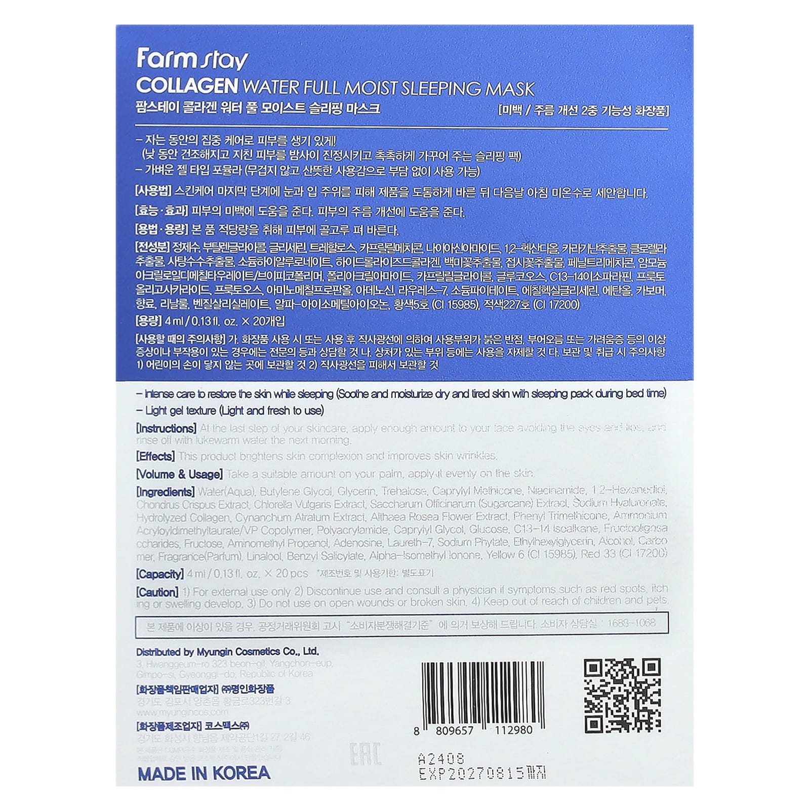 Farmstay Máscara da Bela Adormecida com Água de Colágeno 20 Unidades 4 ml (013 fl oz) Cada – Farmstay Beleza Máscaras Faciais de Beleza Máscaras Faciais Máscaras em folha K-Beauty.