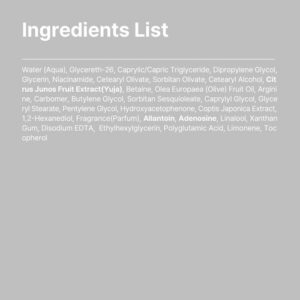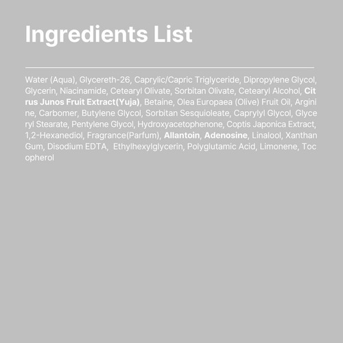 Caprililglicol, estearato de glicerila, pentilenoglicol, hidroxiacetofenona, extrato de Coptis Japonica, 1,2-hexanodiol, fragrância (perfume), alantoína, adenosina, linalol, goma xantana, EDTA dissódico, etilhexilglicerina, ácido poliglutâmico, limoneno, tocoferol