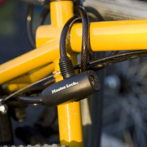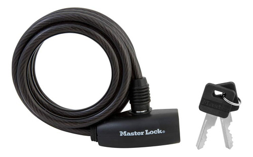 Fechadura de cabo com chave preta Master Lock 8126D de 6' X 5/16" – A trava para bicicleta oferece segurança básica contra roubo. Nota: meça o encosto, o furo transversal e a espessura da porta para garantir que você encontre o ajuste certo. – Melhor usada para bicicletas, escadas, portões, cercas, grades e outras necessidades flexíveis de segurança – Fechadura de bicicleta com chave com mecanismo de travamento integrado para maior resistência ao arrombamento – Características da trava de cabo aço trançado para maior resistência e flexibilidade; o revestimento protetor de vinil evita arranhões – A trava do cabo da bicicleta tem 6 pés (1,8 m) de comprimento com cabo de 5/16 pol. (8 mm) de diâmetro ( inclui revestimento de vinil); duas chaves incluídas