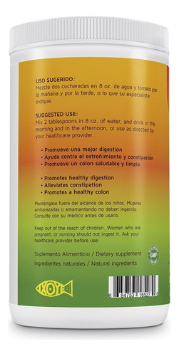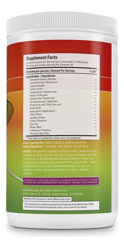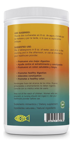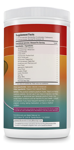 Ingredientes: farelo de aveia, farelo de trigo, linhaça, inulina, casca de psyllium, Pera espinhosa, fibra de maçã, ameixa, erva-doce, pectina de maçã, ameixa seca, gengibre, canela, figo, hortelã, probióticos, fibra de guar e sabor natural de maracujá. Palavras-chave do público-alvo: digestão saudável, alívio da constipação, constipação alívio, cólon saudável, cólon limpo, alimentos ricos em fibras, níveis saudáveis de colesterol, saúde digestiva, desintoxicação do cólon, limpeza intestinal, fibra para colesterol, saúde e casa, desintoxicação, limpeza corporal, bem-estar digestivo, saúde digestiva natural, produto para constipação, suplemento de fibra, melhora o trânsito intestinal, cuidado do cólon