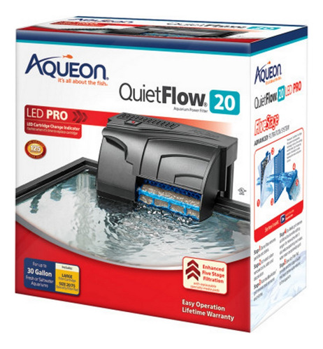 Em destaque está uma luz indicadora de troca de cartucho de filtro LED que pisca quando o cartucho fica entupido com detritos, lembrando que é hora de substituir o cartucho. Um grande benefício dos filtros aqueon de fluxo silencioso é o design interno da bomba que ajuda a amortecer o ruído, elimina vazamentos e é autoescorvante, o que significa que ela é inicializada automaticamente após a limpeza ou interrupções de energia. Taxas de fluxo mais altas também garantem um maior teor de oxigênio dissolvido para peixes mais saudáveis e ativos. Há cinco estágios totais de filtragem mecânica, química, biológica e uma almofada especial adicional para obter a água mais limpa, clara e saudável. Etapa 1 O fio dental denso remove partículas e detritos. Etapa 2 O carvão ativado remove toxinas, odores e descoloração. Estágio 3 O Bio-Holster fornece área de superfície para bactérias benéficas que removem amônia e nitritos tóxicos. Estágio 4 – A grade de mídia biológica suporta o estabelecimento adicional de bactérias benéficas enquanto adiciona mais oxigênio. Também reduz os respingos, tornando o retorno excepcionalmente silencioso. Etapa 5 Opção de almofada de filtro especial para carbono adicional, redutor de amônia ou removedor de fosfato. Todos os filtros usam cartuchos de filtro de reposição Aqueon e almofadas de filtro especiais Aqueon. QuietFlow LED Pro 10 Cartucho médio. QuietFlow LED Pro 20, 30 e 50 Cartucho grande. QuietFlow LED Pro 75 dois cartuchos grandes. Troque o cartucho do filtro a cada 4 semanas para obter melhores resultados. A luz indicadora LED pisca quando a água não consegue passar pelo cartucho, geralmente indicando que é hora de trocar o cartucho. A bomba de filtro com escorvamento automático iniciará automaticamente inicialmente ou reiniciará se a energia for interrompida e restaurada. Fornece filtragem mecânica, química, biológica e opcional, com almofadas especiais. Altas taxas de fluxo para um conteúdo ideal de oxigênio dissolvido para promover peixes mais saudáveis e ativos. O design interno da bomba ajuda a amortecer o ruído e eliminar vazamentos com o recurso de escorvamento automático. Não limpe o Bioholster ao substituir o cartucho, pois ele contém bactérias biológicas benéficas. Adequado para aquários de água doce ou salgada de até 90 galões. Usa dois cartuchos grandes de reposição Aquaon e almofadas de filtro especiais tamanho 20/75.