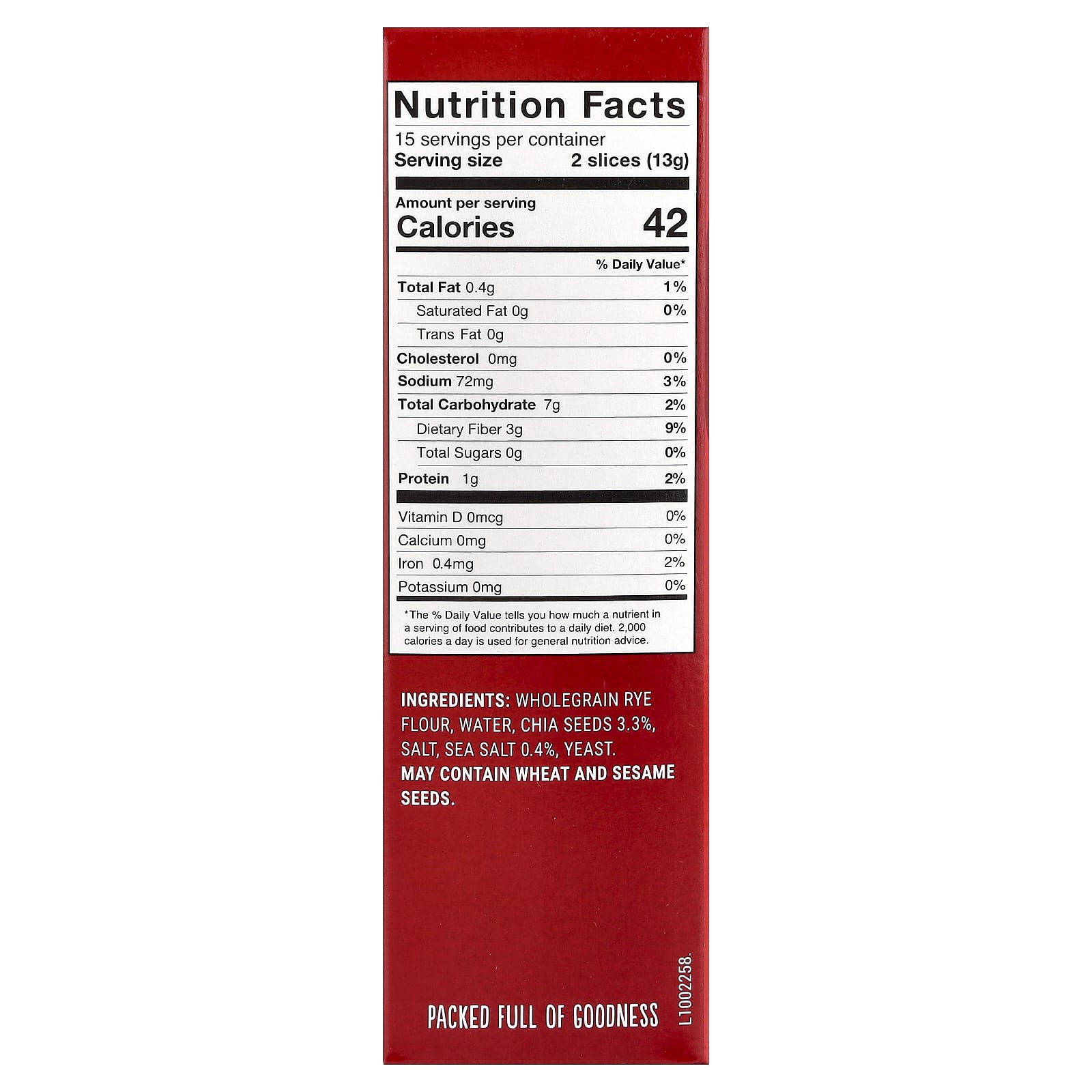 Farinha de centeio integral, água, sementes de chia 3,3%, sal, sal marinho 0,4%, fermento.