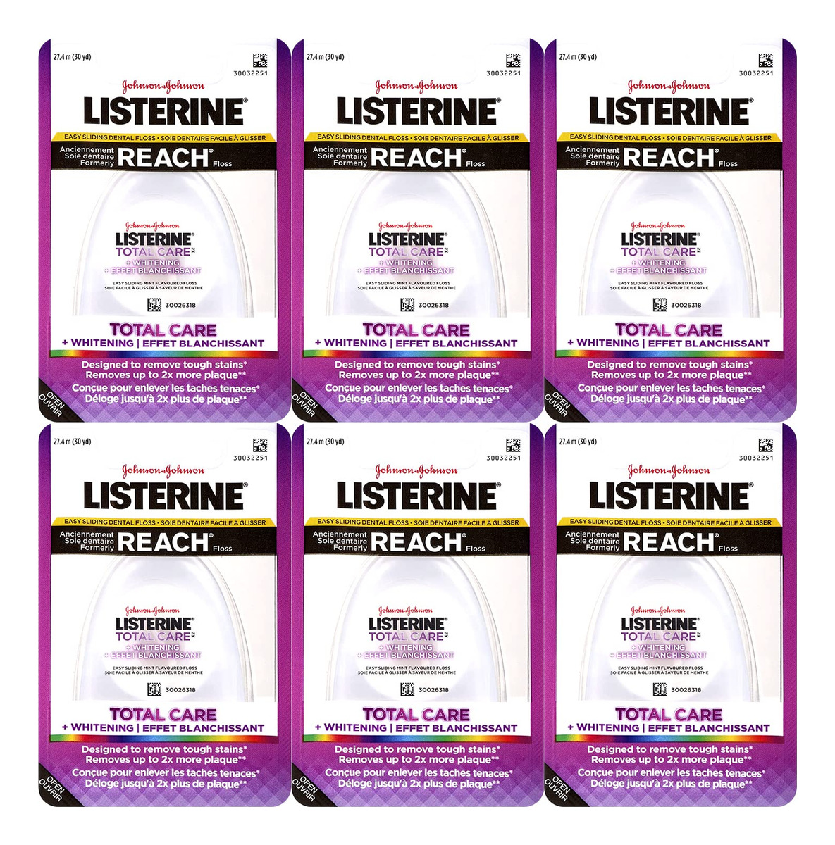 Fio dental branqueador Listerine Total Care, 30 metros (pacote com 6) – Fio dental Listerine de menta que se estica e flexiona para deslizar facilmente entre os dentes – Remove pequenas partículas de alimento que ficam presas entre os dentes e que podem causar mau hálito – Ajuda a proteger seus dentes e gengivas limpando com eficácia locais de difícil acesso que a escovação pode perder – O fio dental Listerine Total Care oferece uma explosão de sabor de menta para uma limpeza fresca – 30 jardas cada pacote, pacote de 6