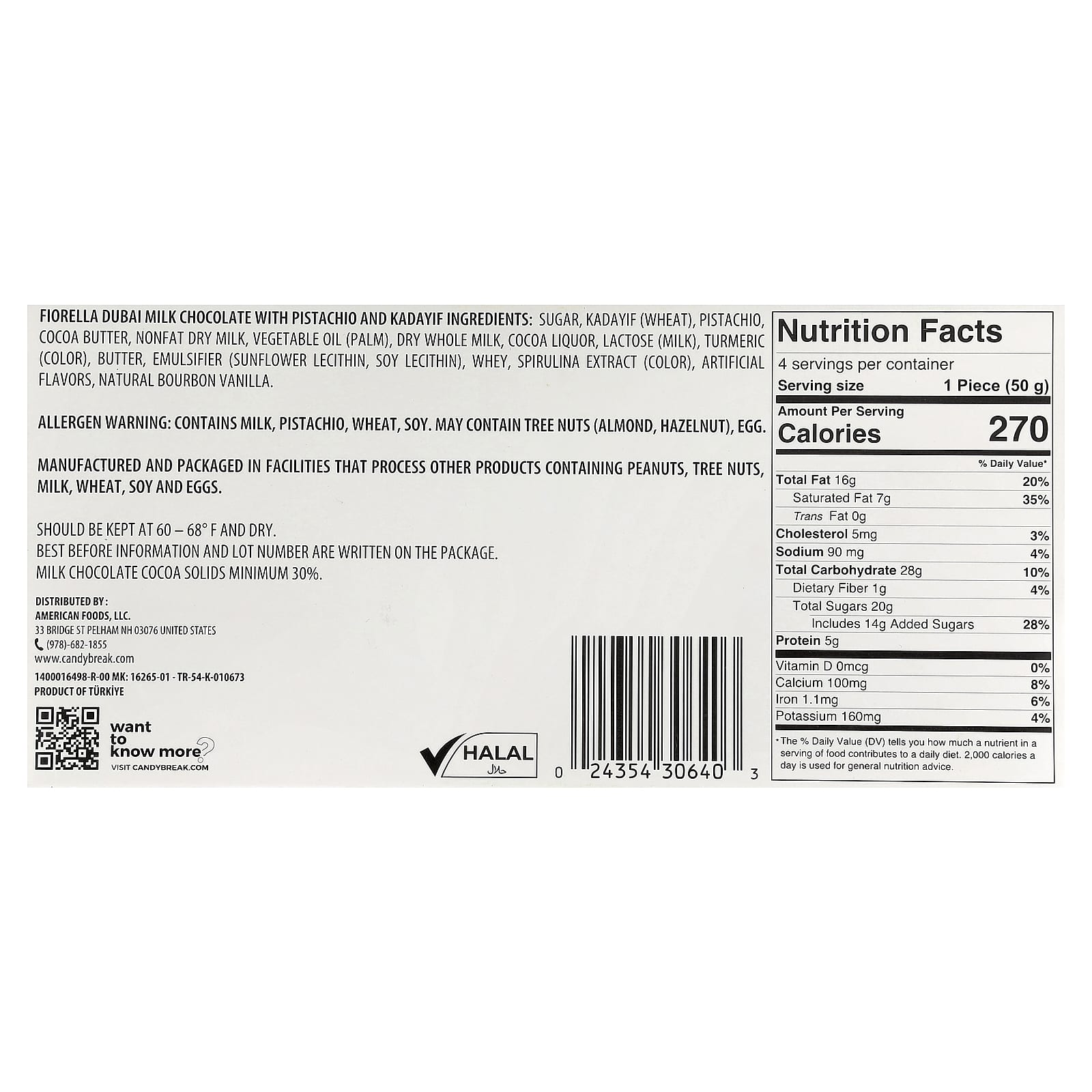 Açúcar, kadayif (trigo), pistache, manteiga de cacau, leite desidratado sem gordura (desnatado), óleo vegetal (palma), leite integral em pó, licor de cacau, lactose (leite), cúrcuma (corante), manteiga, emulsificante (lecitina de girassol, lecitina de soja), whey, extrato de espirulina (corante), sabores artificiais, bourbon de baunilha natural.
