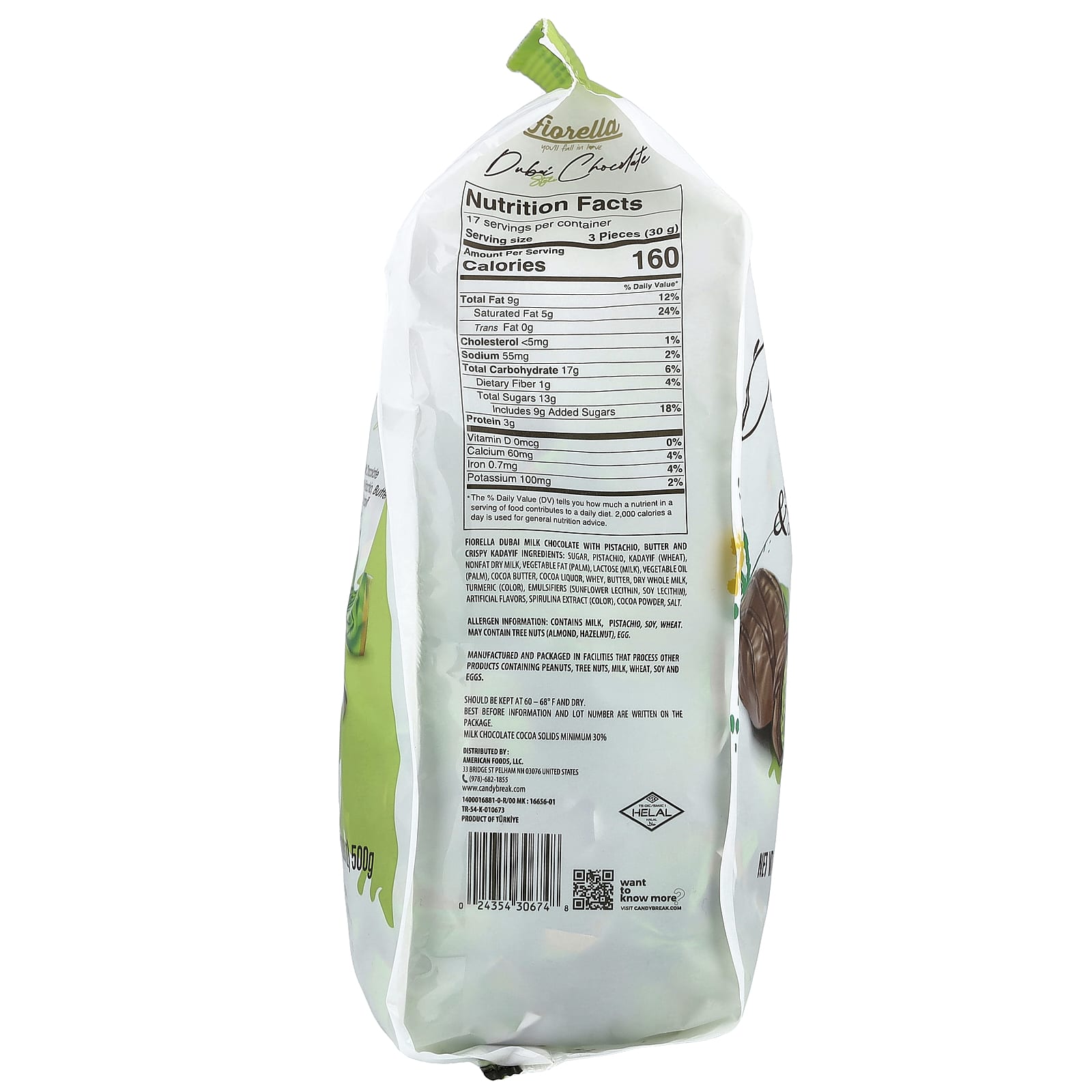 Açúcar, pistache, kadayif (trigo), leite desidratado sem gordura (desnatado), gordura vegetal (palma), lactose (leite), óleo vegetal (palma), manteiga de cacau, licor de cacau, whey, manteiga, leite integral em pó, cúrcuma (corante), emulsificantes (lecitina de girassol, lecitina de soja), sabores artificiais, extrato de espirulina (corante), cacau em pó, sal.