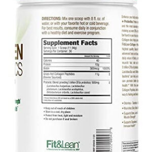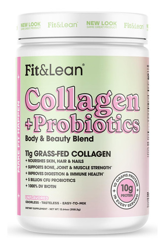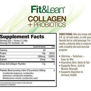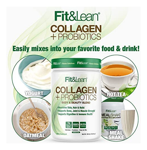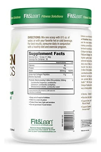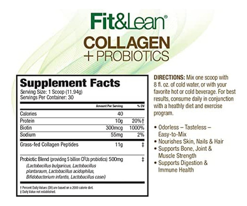 Melhore seu corpo e beleza com Fit & Lean Collagen +probióticos. A proteína é a base de um corpo saudável, e a proteína mais abundante no corpo é o colágeno, constituindo mais de 30% do total de proteínas do corpo. O colágeno pode ser encontrado no cabelo, pele, unhas, músculos, ossos e articulações. Fit & Lean Collagen + Probiotics apresenta 11 gramas de peptídeos de colágeno alimentados com capim de qualidade, além desta fórmula avançada de corpo e beleza também contém 1000% do valor diário de biotina, uma coenzima crítica envolvida no metabolismo, influenciando o crescimento e a força de cabelo, pele e unhas. Por último, também contém 5 mil milhões de UFC de probióticos, de 5 estirpes únicas, incluindo os géneros Lactobacillus e Bifidobacterium. Essas bactérias boas podem ajudá-lo a construir uma microbio Me saudável, que pode promover melhor regularidade e saúde imunológica. Com esta poderosa combinação de peptídeos de colágeno alimentados com capim, biotina e probióticos, você estará no caminho certo para se sentir linda e em forma! 300mcg de biotina para maior beleza, saúde e metabolização de gordura (1000% DV) Color: Sin sabor. Marca: Fit & Lean Dimensiones: 0.18 x 0.13 x 0.10mts. Peso del Producto: 0.45 Kilogramos. Peso de Envio: 0.45 Kilogramos. Modelo: Garantia do vendedor: 30 dias
