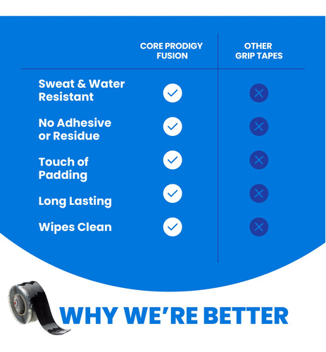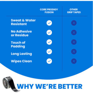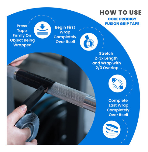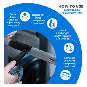 Core Prodigy Fusion – Silicone Grip Tape and Grip Wrap Tape for Barbells, Pull Up Bars, Dumbbells, Sports and Gym Equipment, and Tool Grip Tape Our American Made gripping tape can be used as pull up bar grip tape, weight tape, athletic grip tape, and general gym tape. This athletic sticky tape is self fusing silicone tape made to be self vulcanizing with no adhesive The silicone wrap is the best weightlifting tape for hands to stay where theyre supposed to be when lifting heavy weights. Core Prodigy Fusion – Padding and Grip Tape in One! Need extra grip with a little padding for a better workout? Perfect for gym attachments like tricep ropes, curl bars, or as tape for weights or grip tape for pull up bar attachments. Want the ultimate slap shot? Use the Fusion Grip Tape for the end of a hockey stick or other sports equipment. Adhesive free silicone grip tape adheres to itself! – Silicone Rubber Grip Tape made for Pull Up Bars, Barbells, Dumb Bells, Weights, Sports Equipment, Tool Handles, and anywhere else you need a great non-slip grip with a touch of padding. Other common uses are tricep ropes, ez curl bars, push-up bars, pullup hand grips, and other gym attachments. – No Adhesive! Self-Fusing Tape only sticks to itself – Provides sticky grips without any residue on your equipment or your hands. The sticky grip tape performance comes from the stretch and seal self fusing silicone tape rather than adhesive, Stays on long term but its easy to remove the silicone when you want. – No-Slip Lightly Padded Grip – Use Core Prodigy Fusion where you need zero slippage and a slight shock absorbing grip tape. – Highly Versatile – Great handle wrap grip for sports equipment and home uses. Whether at the gym or on the field, get a strong grip on your hockey stick, baseball bat, lacrosse stick, tools, handle bars, and more. – Quality You Can Feel – Fusion Grip Tape is made in the USA. Each product is inspected with the highest quality standards. If you are unhappy for any reason, we will make it right.