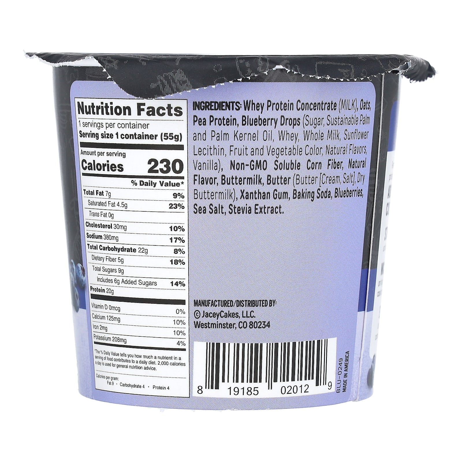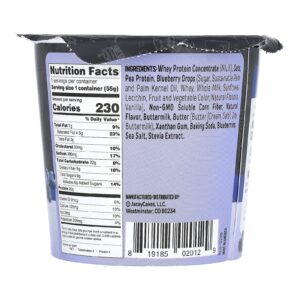 Concentrado de proteína whey (leite), aveia, proteína de ervilha, gotas de mirtilo (açúcar, óleo de palmiste e óleo de palma sustentável, whey, leite integral, lecitina de girassol, corante de frutas e vegetais, sabores naturais, baunilha , fibra de milho solúvel não OGM, sabor natural, soro de leite coalhado, manteiga (manteiga [creme, sal], leitelho seco), goma xantana, bicarbonato de sódio, mirtilos, sal marinho, extrato de estévia.
