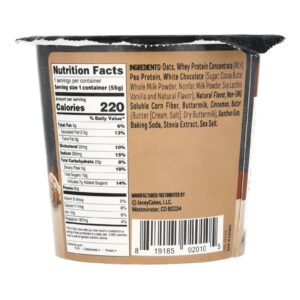 Aveia, concentrado de proteína whey (leite), proteína de ervilha, chocolate branco (açúcar, manteiga de cacau, leite em pó integral, leite em pó desnatado, lecitina de soja, baunilha e sabor natural), sabor natural, fibra de milho solúvel não OGM, soro de leite coalhado, canela, manteiga (manteiga [creme, sal], leitelho seco), goma xantana, bicarbonato de sódio, extrato de estévia, sal marinho.