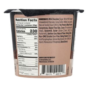 Chocolate ao leite (açúcar, leite em pó integral, chocolate sem açúcar, manteiga de cacau, gordura de leite, lecitina de soja, sabor natural de baunilha) (leite), proteína de ervilha, concentrado de proteína whey, aveia sem glúten, cacau (processado com álcali), leitelho, manteiga (manteiga [creme, sal], leitelho seco), goma xantana, sabor natural, bicarbonato de sódio, fibra de milho não OGM solúvel, fermento em pó (pirofosfato ácido de sódio, bicarbonato de sódio, amido de milho não OGM, monofosfato de cálcio), extrato de estévia.