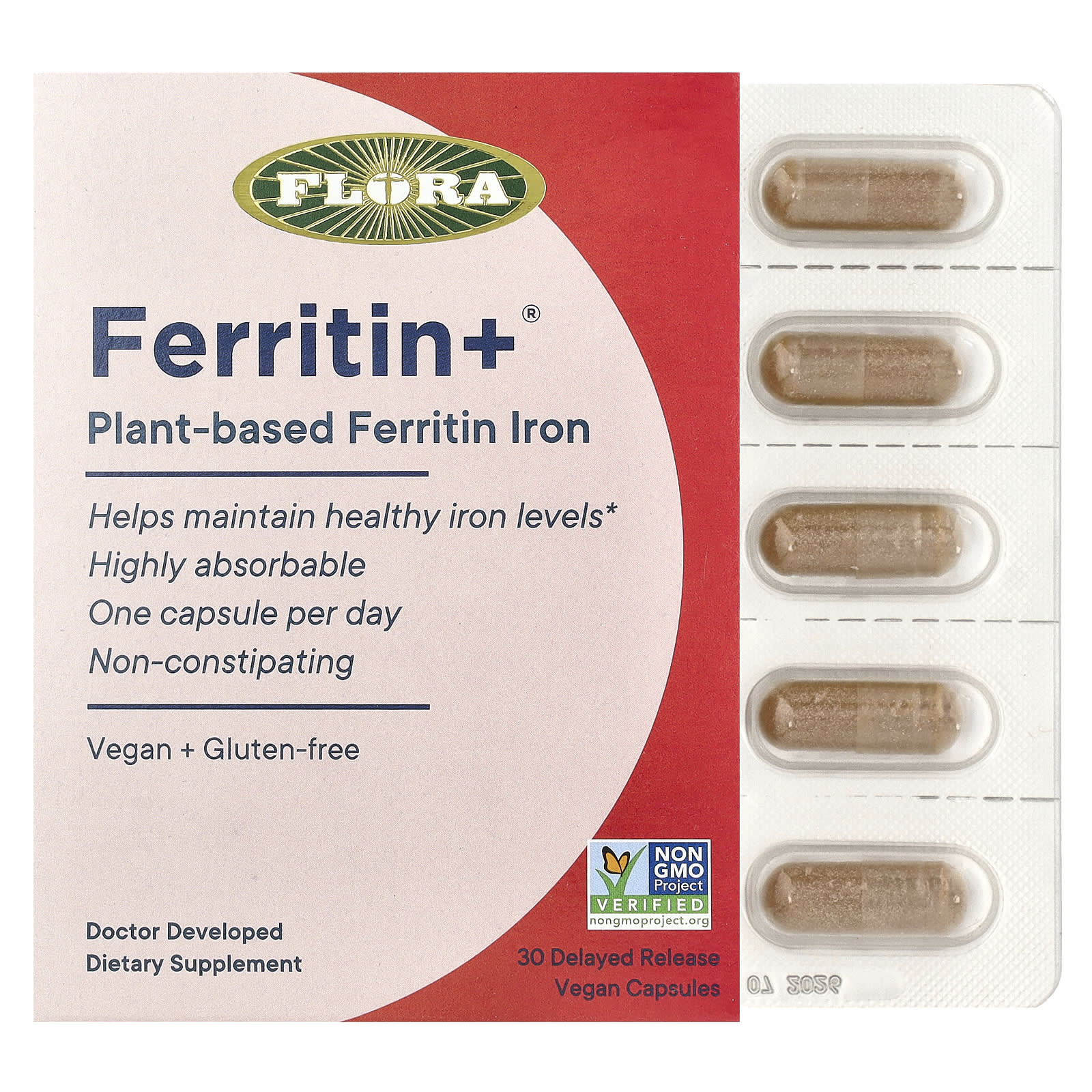 Flora Ferritin+® Ferritina Ferrosa à Base de Plantas 30 Cápsulas Veganas de Liberação Retardada (20 mg por Cápsula) – Flora Suplementos Minerais Ferro.