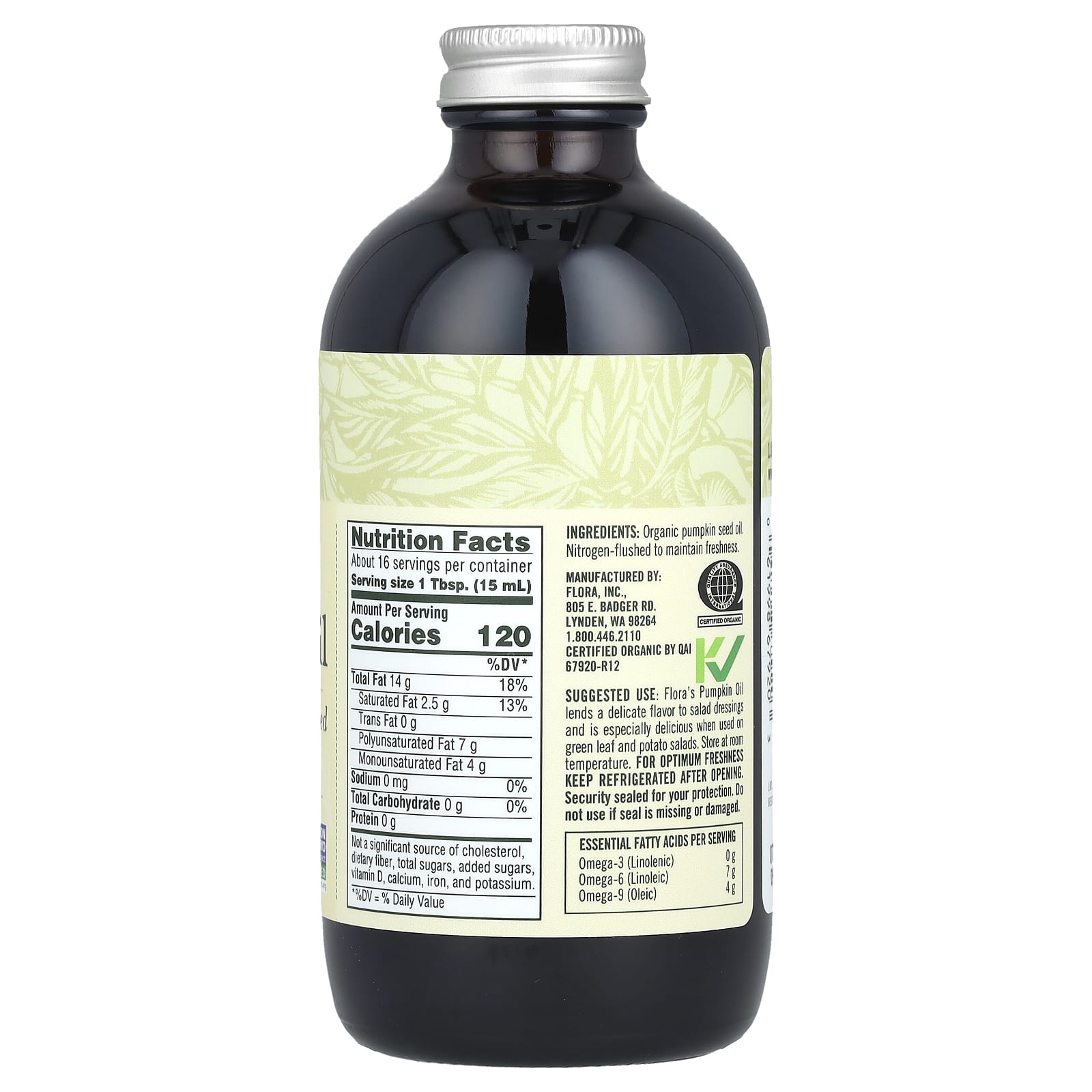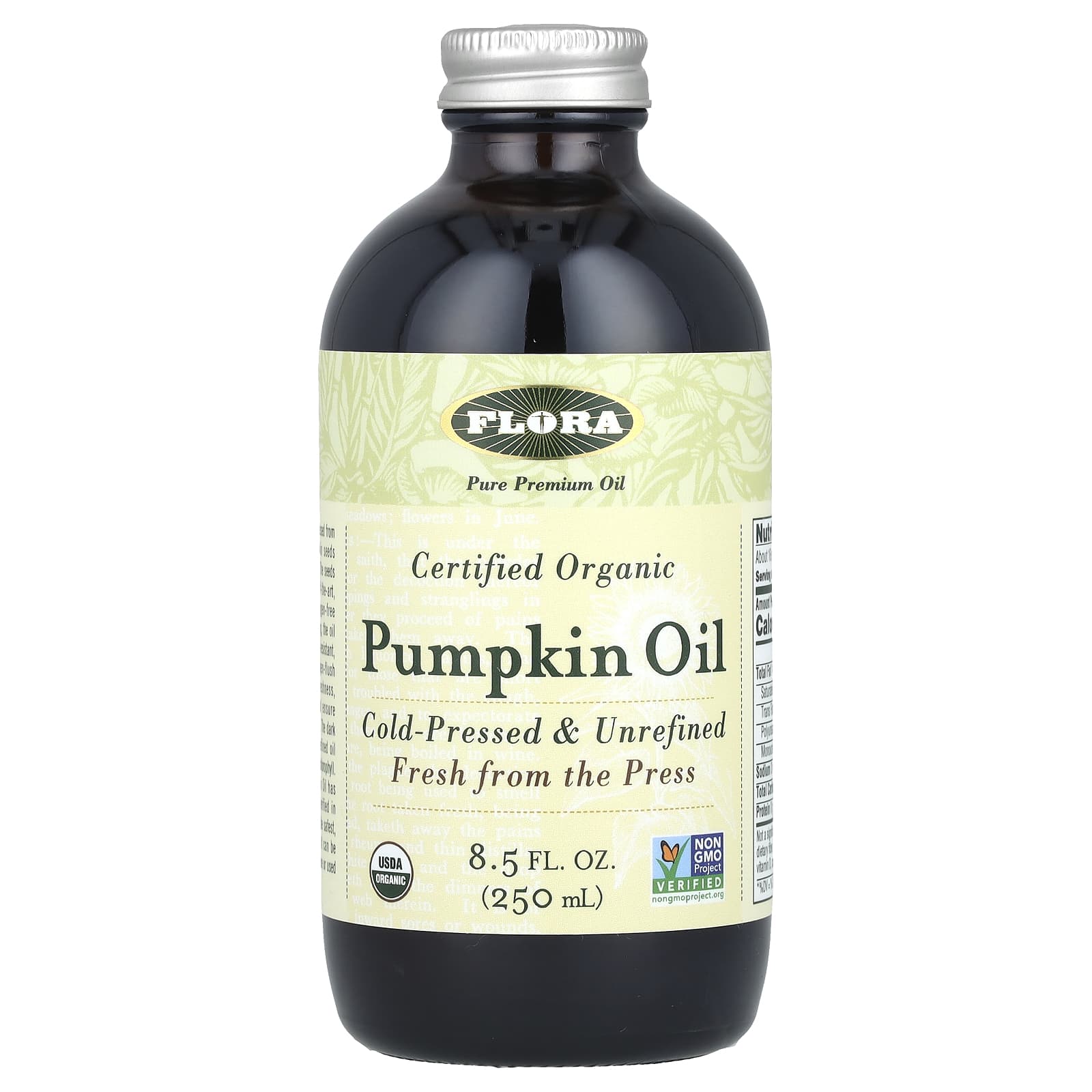 O Óleo de Abóbora da Flora é extraído de sementes de abóbora orgânica certificadas (certificação de terceiros). As sementes são prensadas em um ambiente de última geração, com baixo calor, sem luz e oxigênio. Após a prensagem, o óleo é cuidadosamente envasado em vidro âmbar resistente à luz com uma sensação de nitrogênio para manter o frescor ideal, minimizar a oxidação e garantir o máximo valor nutricional. A cor escura deste óleo natural não refinado significa um alto teor de clorofila. O Óleo de Abóbora não refinado da Flora foi Non-GMO Project Verified para fornecer o óleo mais seguro e saboroso possível. Ela pode ser tomada diretamente para uso interno ou usada para cozinhar.