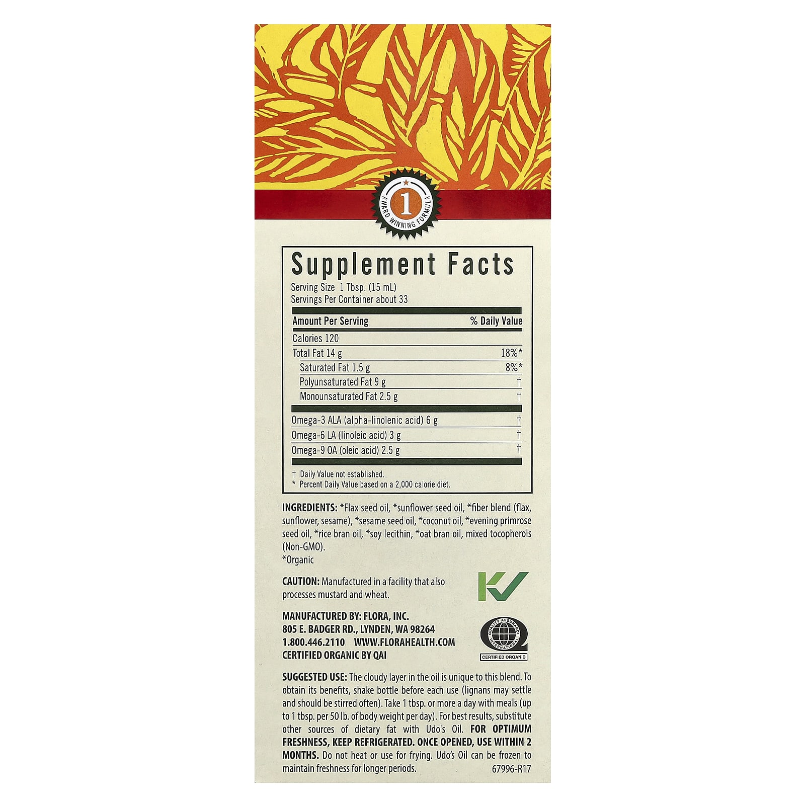 Flora Udos Choice Mistura 3-6-9 de Lignanas 3-6-9 com Certificado Orgânico Udos Oil 500 ml (17 fl oz) – Flora Suplementos Ômegas e Óleos de Peixe (EPA/DHA) Óleo e Suplementos de Linhaça.