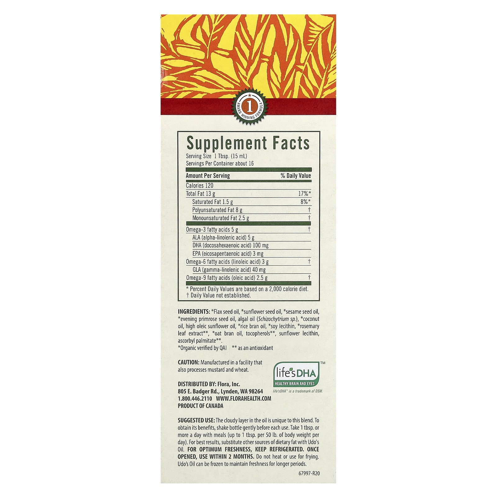 Flora Udos Choice Udos Oil Mistura DHA 3-6-9 250 ml (85 fl oz) – Flora Suplementos Ômegas e Óleos de Peixe (EPA/DHA) Óleo e Suplementos de Linhaça.