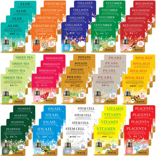 – 15 tipos: 1. Aloe, 2. Coenzima Q10, 3. Colágeno, 4. Pepino, 5. Chá verde, 6. Pearl, 7 anos. Placenta, 8. Granada, 9. Batata, 10. Ginseng vermelho, geleia real, 15. Algas marinhas, caracol, 15. Vitamina: