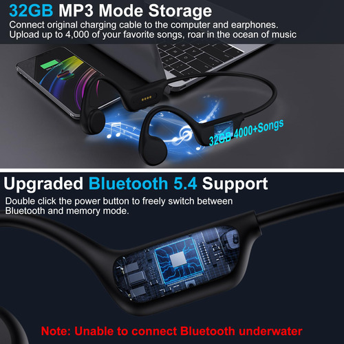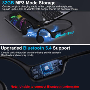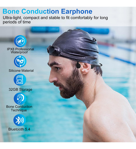 Fones de ouvido de natação por condução óssea – fones de ouvido abertos para natação por condução óssea: equipados com a mais recente tecnologia de fones de ouvido, esses fones de ouvido de natação permitem que você fique atento ao ambiente e aos objetos enquanto os usa. Pesando apenas 30 gramas, é ergonomicamente projetado, leve e confortável e pode ser usado o dia todo. Comparado aos fones de ouvido convencionais, é mais limpo, seguro e menos desgastante para os ouvidos, evitando danos auditivos – Nível profissional de impermeabilidade IPX8: com uma classificação IPX8 à prova d'água, você pode trabalhar embaixo d'água e usar óculos e touca de natação. Essa classificação é apropriada para nadadores. Com sua resistência profissional à prova d'água e à umidade, é perfeito para atividades como natação, corrida, ciclismo e exercícios, pois evita a transpiração e a chuva – modo MP3 e memória de 32 GB: usando o cabo de carregamento magnético incluído, conecte seu computador e fones de ouvido aos 32 GB de memória embutida. O computador então lerá a unidade flash USB e permitirá que você copie músicas do seu computador para ela. Salve sua música preferida em seu capacete; o modo MP3 permite que você ouça música sem se conectar a outros dispositivos ou ao telefone a qualquer hora ou lugar. Adequado para natação, atividades ao ar livre, dirigir, fazer exercícios internos, viajar e muito mais – Novo Bluetooth 5.4 e 7 horas de reprodução atualizado: equipado com o mais recente chip Bluetoeth 5.4, que melhora consideravelmente a velocidade, a distância e a estabilidade da comunicação, com as vantagens de quase latência zero e baixo consumo de energia, proporcionando uma experiência musical maravilhosa. Totalmente carregado, ele pode fornecer até 7 horas de reprodução contínua de música ou chamadas telefônicas. Dica: o Bluetooth não pode transmitir debaixo d'água, use o modo MP3 para jogar embaixo d'água – Atendimento ao cliente: nossos fones de ouvido de natação por condução óssea vêm com garantia de um ano. Temos uma equipe profissional de atendimento ao cliente. Se você encontrar algum problema durante o uso, entre em contato conosco imediatamente e nossa equipe de atendimento ao cliente fornecerá uma resposta satisfatória em 24 horas