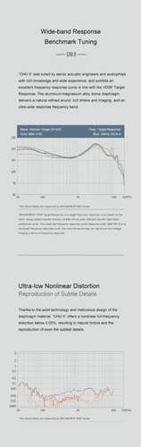 CHU II foi ajustado por engenheiros acústicos e audiófilos de alto nível com rico conhecimento e vasta experiência, e exibe uma excelente curva de resposta de frequência de acordo com o objetivo VDSF resposta. 6. Distorção não linear ultrabaixa, reprodução de detalhes sutis.