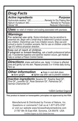 – Ingredientes cuidadosamente escolhidos, sem preenchimentos: Forces of Nature A psoríase oferece resultados por meio de ingredientes naturais e orgânicos cuidadosamente selecionados pensando na saúde. Você não encontrará enchimentos desnecessários ou ingredientes produzidos sinteticamente nos produtos Forces of Nature. A psoríase não contém produtos químicos sintéticos. Sem esteróides, sulfatos, parabenos ou fragrâncias artificiais. Formulado para uso diário conforme necessário.
